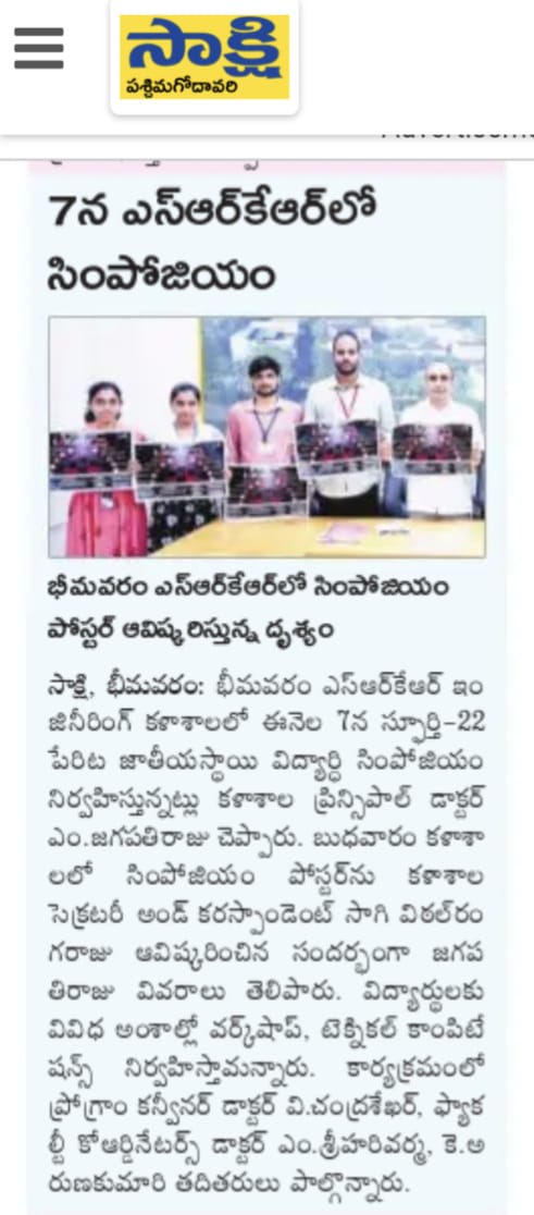 The Dept of CSE at SRKR is going to conduct National Level Student Symposium SPURTHI22 on May 7th, 2022 Principal Dr. M. Jagapathi Raju had said. The poster relating to the same was inaugurated by Secretary & Correspondent of SRKR Sri. SV Ranga Raju. Program convener an HOD of CSE Dr. Chandrasekhar had said that students would undergo various workshops and technical competitions as a part of this event. Dr. M. Srihari Varma and K. Aruna Kumari will act as Faculty Coordinators and S. Yasin and G. Supraja will act as student coordinators.