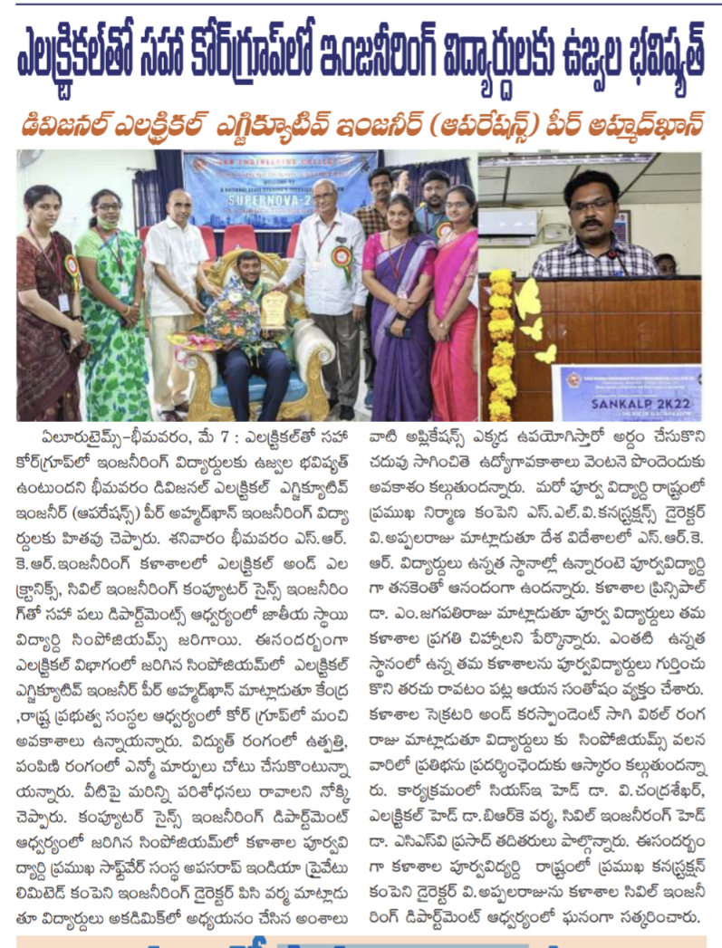 National Level Student Symposiums were being conducted by various departments at SRKR Engg College on 7th May, 2022. Divisional Electrical Executive Engineer (Operations) of Bhimavaram Mr. Peer Ahmed Khan who was the chief guest at Symposium of EEE Dept had said that students are going to have a bright future in core branches. Chief Guest of CSE Dept Symposium Mr. PC Varma, a prominent Alumni of SRKR and Director of a Software Company had suggested the students to learn the applications of software in various fields through which they will have a good chances of getting prominent jobs. Chief Guest of Civil Dept Symposium Mr. V. Appalaraju, Director of Prominent Construction Company SLV had said that it was indeed a matter of great pride that alumni of SRKR are in prominent positions across the globe. Principal Dr. M. Jagapathi Raju had said that alumni of SRKR are the symbols of development and their frequent visits to the institution are of great help in guiding the present students. Secretary&Correspondent of SRKR Sri. SV Rangaraju had said that Symposiums will provide a platform for the students to showcase their skills and talents. HODs of various departments had participated in these symposiums and the chief guests were felicitated by the management in a grand manner.
