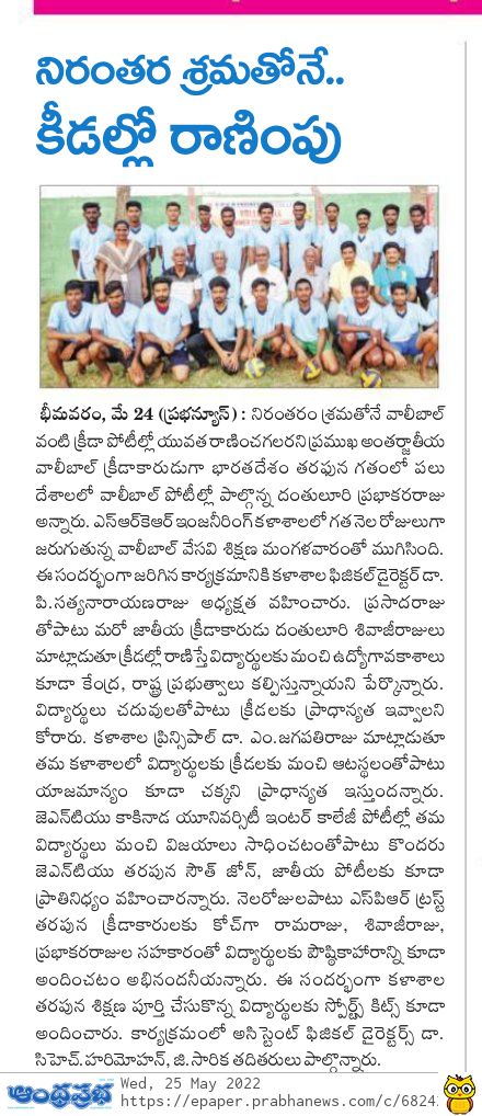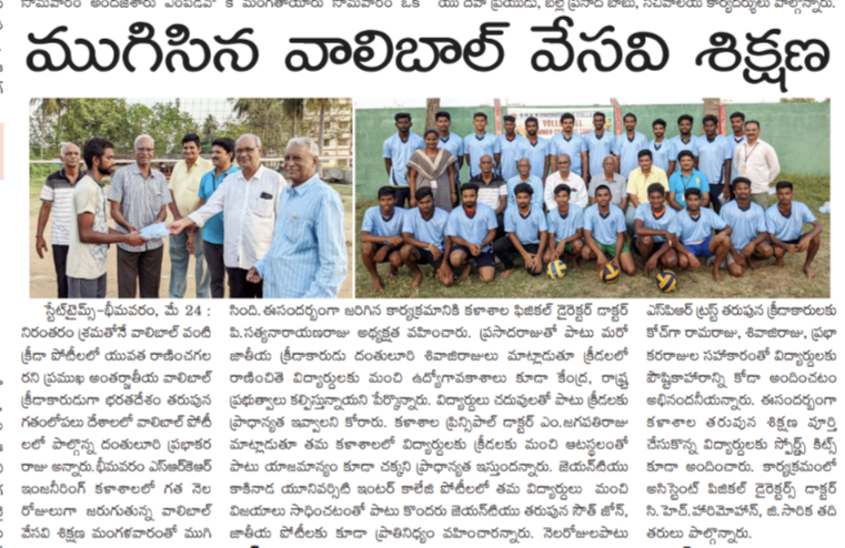 The volleyball coaching camp at SRKR which is being conducted for the last one month has ended on 24th May, 2022. Speaking on this occasion former national volleyball player and trainer Dantuluri Prabhakar Raju had said that students will excel in the field of sports only through continuous commitment and hard work. Former National Volleyball Player Shivaji Raju had said that studies can land in good jobs at state and central level by excelling in the field of sports and students should give importance to sports too along with academics. Principal of SRKR Dr. M. Jagapathi Raju had said that the college management is willing to support the students in the area of sports and that is the reason for many SRKR students being placed in University team for many national events. Sports kits were being handed over to students who took part in this camp. Physical Director of SRKR Dr. P. Satyanarayana Raju had presided over this meeting. Assistant Physical Directors Dr. Harimohan and G. Sarika also took part in this meeting.