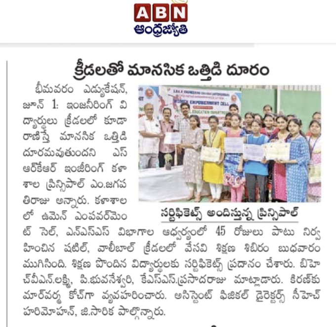 The shuttle coaching camp at SRKR which was being conducted for the last 45 days has ended on 31st May, 2022. This was organized in collaboration with Women Empowerment Cell, NSS Unit and Physical Education Dept. Speaking on this occasion, Principal Dr. M. Jagapathi Raju had said that students can reduce their mental tensions and emerge victorious by taking part in various sports. He said that the management is planning to provide better sports infrastructure to the students and je urged the students to keep up the name of the college in sports arena too along with the academic arena. Women Empowerment Cell Coordinator Dr. Bhuvaneshwari and NSS Coordinator Mr. Prasada Raju had said that there was huge response from the students towards this camp. Head of English Dept Dr. Lakshmi, Coach Dr. Kirankumar Varma, Vidyasagar and Physical Directors G. Harimohan and Ms. Sarika also took part in this programme.