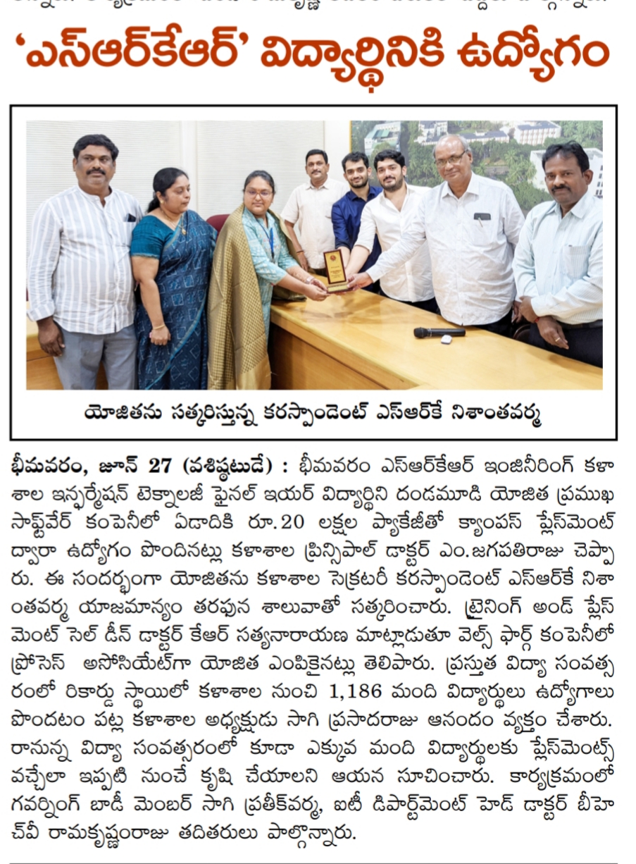 Final Year IT student Ms. Yojitha Dandamudi was selected for prominent IT Company WELLS FARGO with a package of 20 LPA. The management had felicitated her on this occasion. Speaking on this occasion Dean Placements Dr. Satyanarayana had said that Yojitha was selected as a Process Associate at Wells Fargo. President of SRKR Dr. Prasad Raju had expressed his happiness that all the eligible Final Year students had been placed with a record placement of 1186 offers. The students as well as their parents are very happy about these rare feet. Secretary Cum Correspondent of SRKR Sri. SRK Nishanth Varma and Governing Body Member Mr. Pratik Varma had suggested the placement team to start the training for the upcoming batches on war front and make sure that the placements increase year by year. HOD of IT Dept Dr. BHV Ramakrishnam Raju had also participated in this occasion.