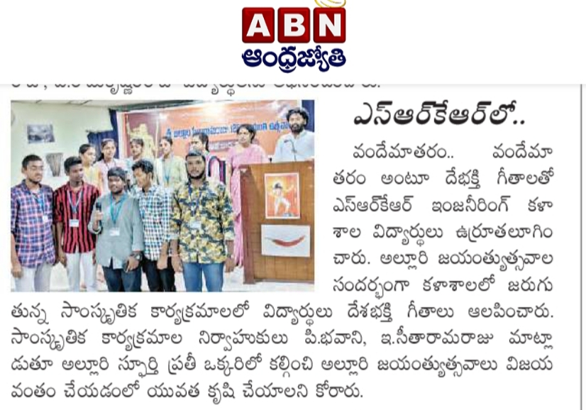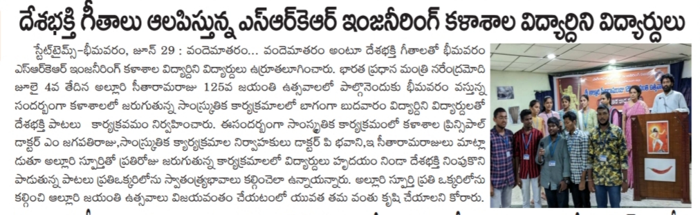 The 125th Anniversary Celebrations of Prominent Freedom Fighter Sri. Alluri Sitarama Raju had begun at SRKR Engg College on 27th June, 2022. These celebrations had gained major importance in view of the visit of the Honourable Prime Minister of India Mr. Narendra Modi to Bhimavaram on 4th of July, 2022. Speaking on this occasion Principal of SRKR Dr. M. Jagapathi Raju had said that these celebrations should inspire everyone regarding the life and passion of Alluri Sitarama Raju. He said that Alluri had inspired many people in his tender age and made them revolt against the British empire. The youth of this generation should learn about him and imbibe his leadership qualities. He inspired the students to welcome the Honourable PM of India in a very grand manner. Dr. Lakshmi, Dr. Bhavani. Mr. Seetharamaraju, Mr. Prasad and a large number of students took part in this occasion.