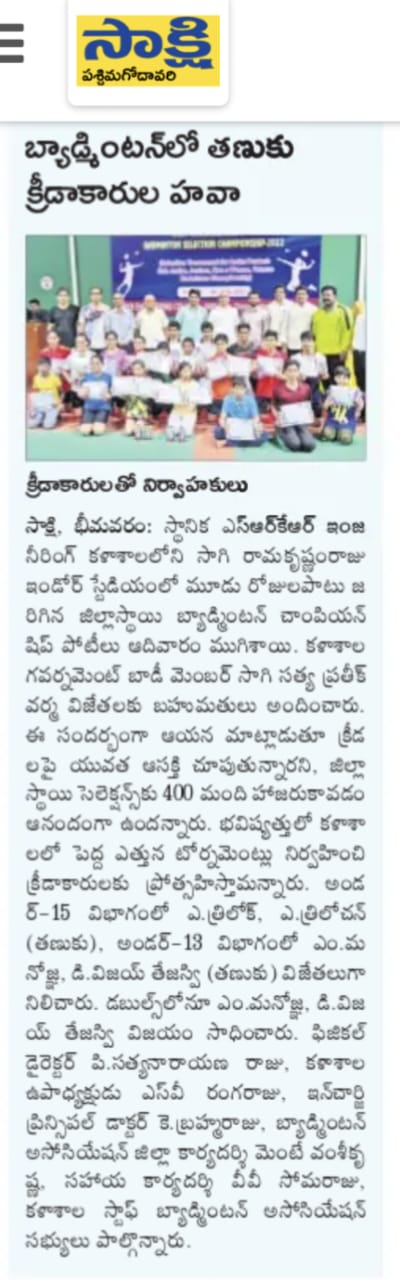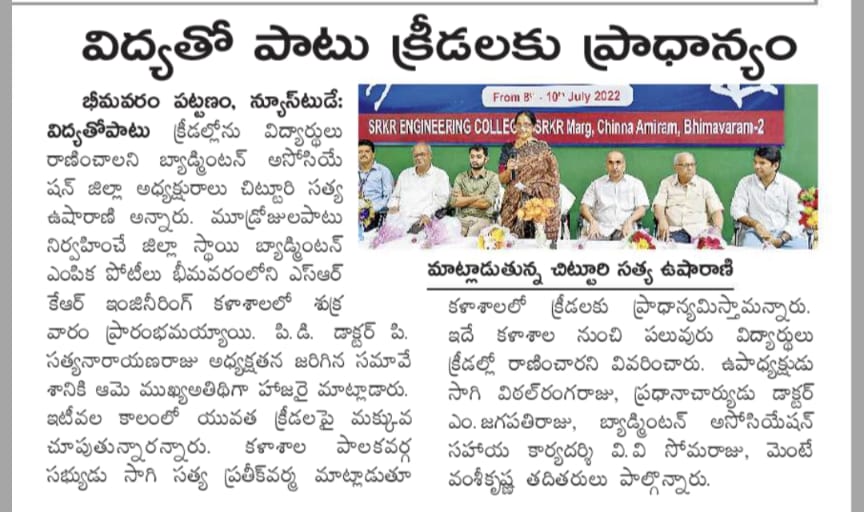The West Godavari District Level Badminton selections were inaugurated at the SRKR Engineering College on 8th July, 2022. Speaking on this occasion West Godavari Badminton Association President Smt. Chitturi Satya Usha Rani had said that its high time that the sports should be given prime importance right from the school level, then we can be able to produce some great players. Governing Body Member of SRKR Sri. S. Pratik Varma had said that at SRKR the management is committed to support sports too along with the studies. Principal of SRKR Dr. M. Jagapathi Raju had said that students should give importance to sports too along with the studies, so that they can grow in their respective careers. Thomas Cup winner and prominent badminton player of India Sri. Srikanth Kidambi inaugurated the event virtually and said that in the coming days more players should represent India at the National Level. He thanked the management of SRKR for giving prime importance to sports. Smt. Usharani was grandly felicitated by the management on this occasion. Vice President of SRKR Sri. SV Ranga Raju, Secretary of Badminton Association M. Vamsi Krishna, Co-Secretary Sri. VV Somaraju had graced this occasion.