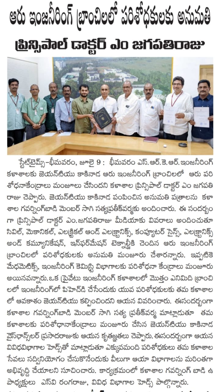 JNTUK has conferred 'Research Centre' status to the departments of CSE, IT, ECE, EEE, Civil and Mechanical Engineering; Principal of SRKR Dr. M. Jagapathi Raju had said. The documents relating to the same were being handed over to Governing Body Member of SRKR, Mr. S. Satya Pratik Varma. Mathematics and Chemistry Departments are already having the research centre status and so it’s a huge opportunity for the young researchers to pursue their research in these 8 departments, principal had said. Mr. Pratik Varma had thanked the VC of JNTUK for grating the research centres and giving an opportunity to promote the research. Vice-President of SRKR Mr. SV Ranga Raju and the HOD’s of CSE, IT, ECE, EEE, Civil and Mechanical Departments participated in this meeting.