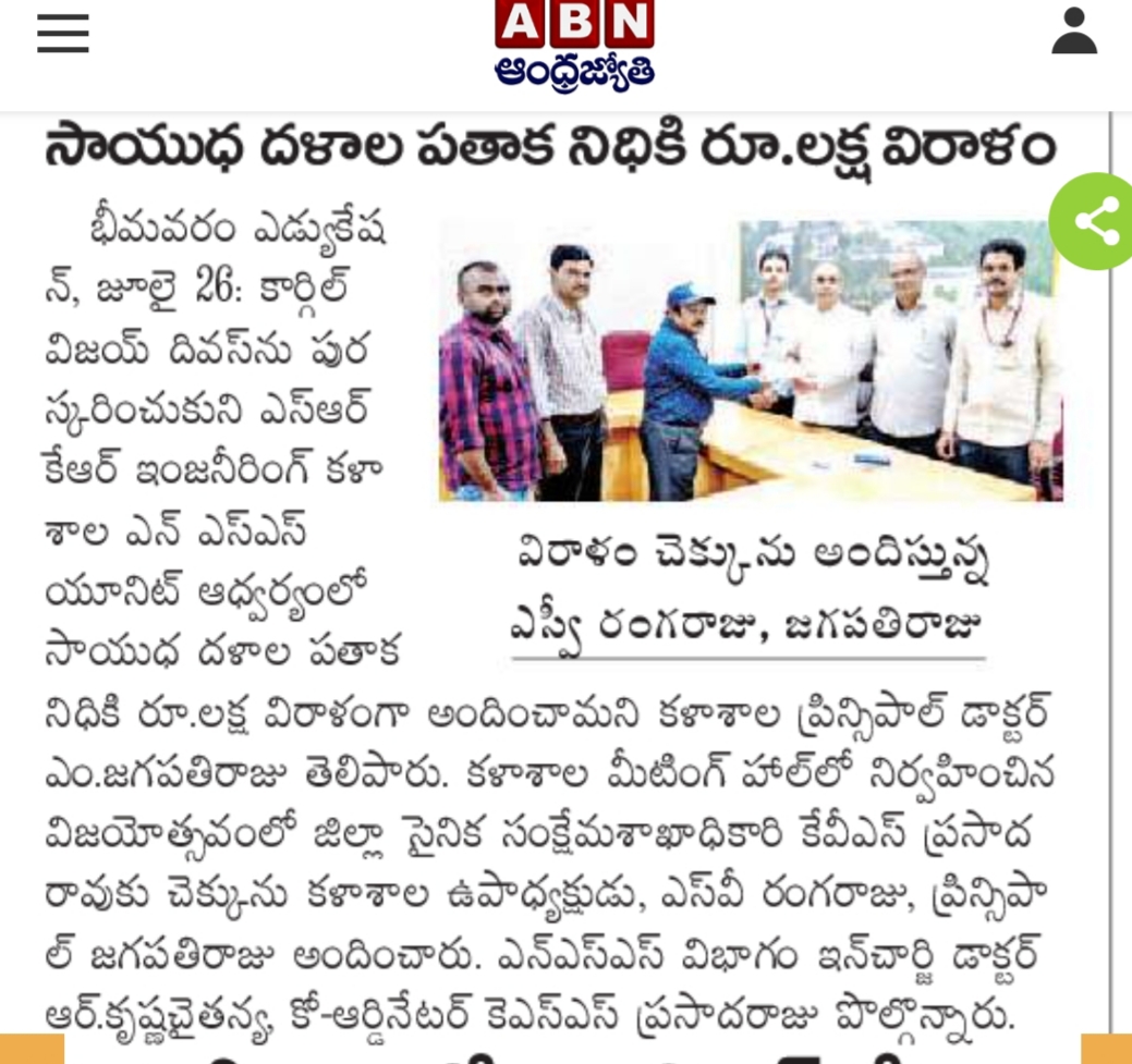 SRKR Engg College had celebrated 'Kargil Vijay Diwas' in a grand manner and donated Rs. 1L to the 'Armed Forces Flag Day Fund'. The cheque was handed over to the District Sainik Welfare Officer Sri. Prasad Rao by the Vice President of SRKR Sri. SV Rangaraju and Principal Dr. M. Jagapathi Raju. NSS In charge Dr. Krishna Chaitanya and Co-Ordinator Mr. Prasada Raju had said that the college faculty and the students donated this amount to the sainik welfare. Speaking on this occasion Principal of SRKR Dr.M.Jagapathi Raju had said that it is the duty of everyone to support the armed forces who are fighting bravely for the country. Everyone paid homage to the martyred soldiers.