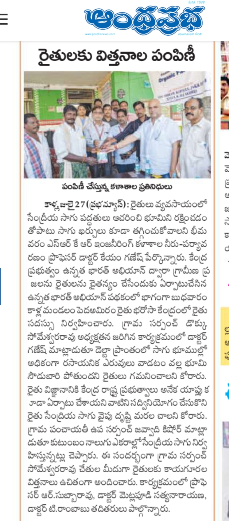 SRKR Engg College under UBA conducted farmers meet at 'Raithu Bharosa Kendram', Peda Amiram village. Speaking on this occasion Prof. Ganesh enlightened the farmers on the concept of 'Organic Farming' so that they can reduce their investment and increase their productivity. He said that the land will lose its fertility because of more fertilizer using. The farmers were distributed with free seeds. Vice President of the village Mr. Kishore, Faculty Dr. Subbarao, Mr. Satyanarayana, Mr. Rambabu participated in this event.