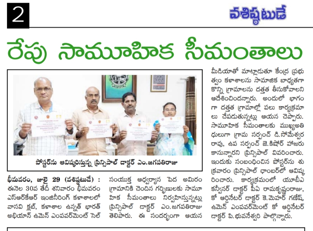 SRKR College under UBA scheme is going to conduct an awareness camp for the pregnant ladies of the Peda Amiram village. This camp will be attended by the President and Vice-President of the village. This programme was being conducted in collaboration with UBA Women Empowerment Cell, Vasavi Club and Village Panchayat of Peda Amiram. Principal of SRKR Dr. M. Jagapathi Raju, UBA Convener Dr. Ramakrishnam Raju, Women Empowerment Cell Coordinator Dr. Bhuvaneshwari participated in this poster release event.