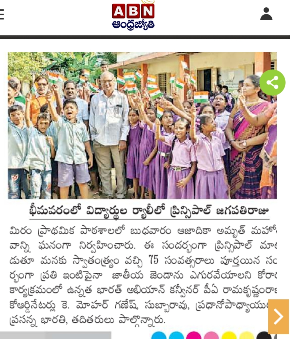 SRKR Engineering College had conducted 'Azaadi Ka Amrit Mahotsav' at Primary school of Peda Amiram village under UBA Scheme. Speaking on this occasion, Principal of SRKR Dr. M. Jagapathi Raju had said that as we are celebrating 75 years of Indian Independence, everyone should hoist and respect the national flag at their homes and other public places. UBA Coordinator Dr. Ramakrishnam Raju, Faculty Mr. Meher Ganesh, Mr. Subbarao and Head Mistress of School Ms. Padmavathi participated in this event.