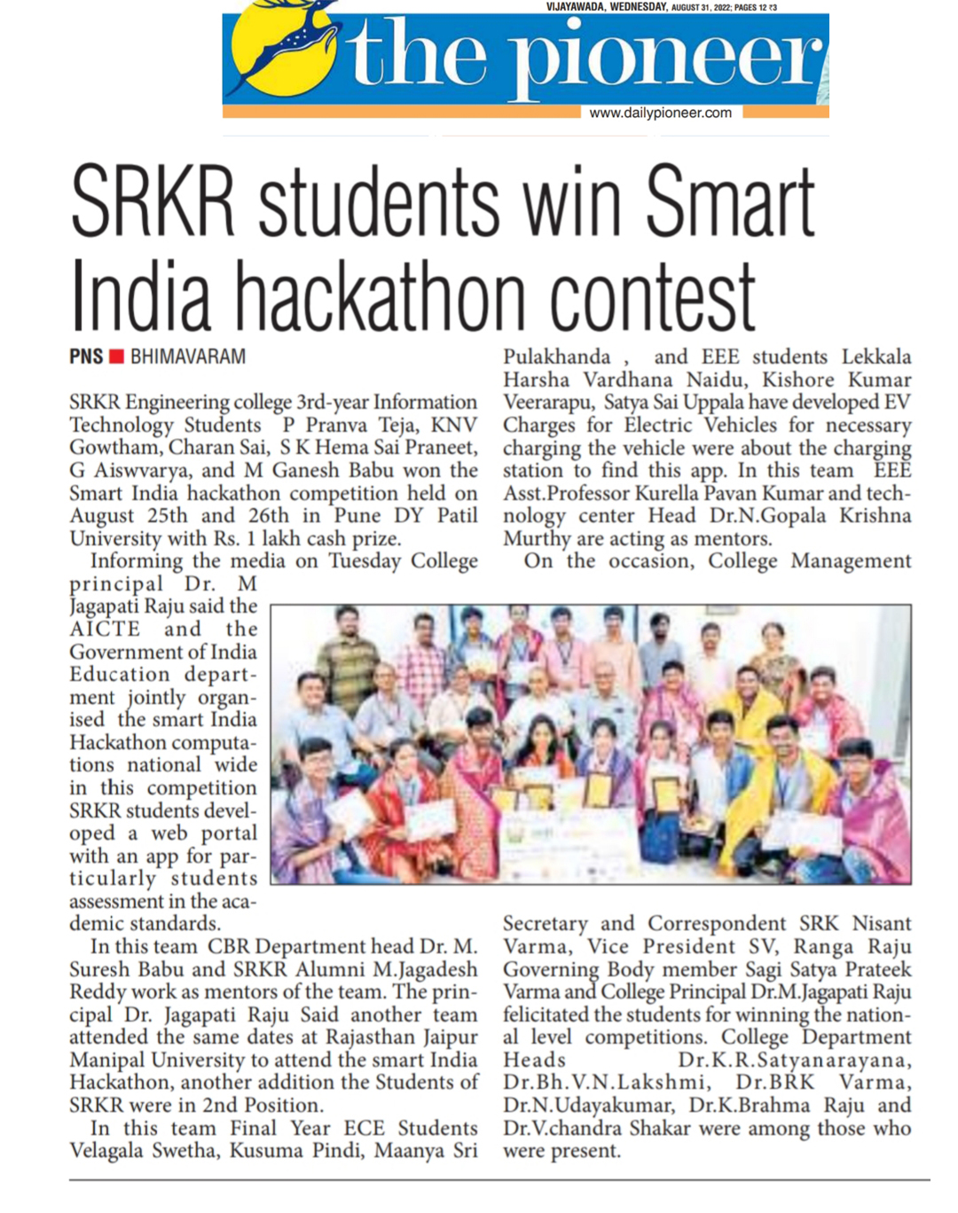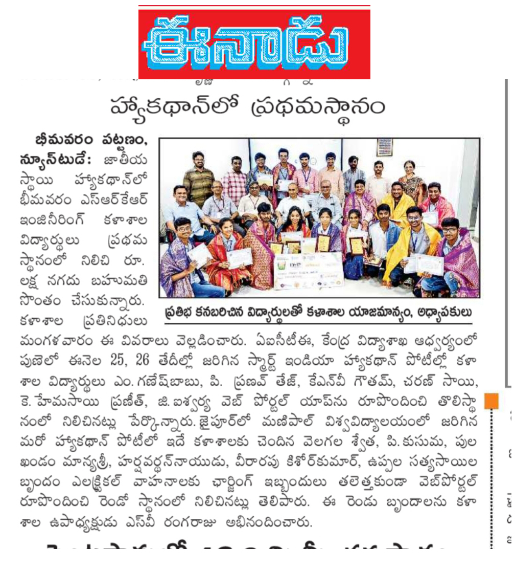 SRKR Engineering College had emerged as the winner in the National Level 'Smart India Hackathon' and received a cash prize of Rs. 1,00,000. This hackathon was conducted under the aegis of AICTE and HRD Ministry at Pune. College students M. Ganesh Babu, P. Pranav Tej, KNV Goutham, Charan Sai, K. Hema Sai Praneeth and G. Aiswarya had developed a web portal and brought accolades to the institution. College students V. Swetha, P Kusuma, P. Manya Sree, Harshavardhan Nayudu, Kishore Kumar, U. Satya Sai had developed a web portal to solve the problems that arises while charging the electric vehicles and stood second at the hackathon conducted at Manipal University, Jaipur.