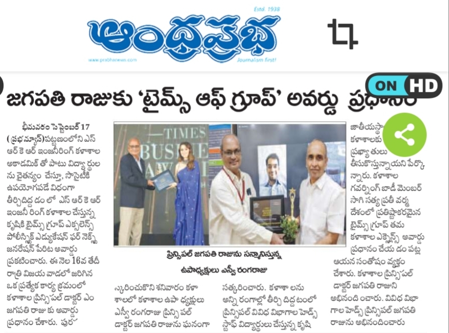 SRKR Engineering College had received ˜Times Group Awards-2022’ in the field of 'Excellence in Holistic Education for Next Generation'. Speaking on this achievement SRKR Vice President Sri. SV Ranga Raju had said that this proud achievement had been bestowed on SRKR for its exemplary contribution in the areas of Societal Development, Educational Excellence and Empowering the students in various sectors. This award had been received by the Principal of SRKR, Dr. M. Jagapathi Raju at Vijayawada on behalf of the institution. The management of the college had felicitated the Principal on this occasion.