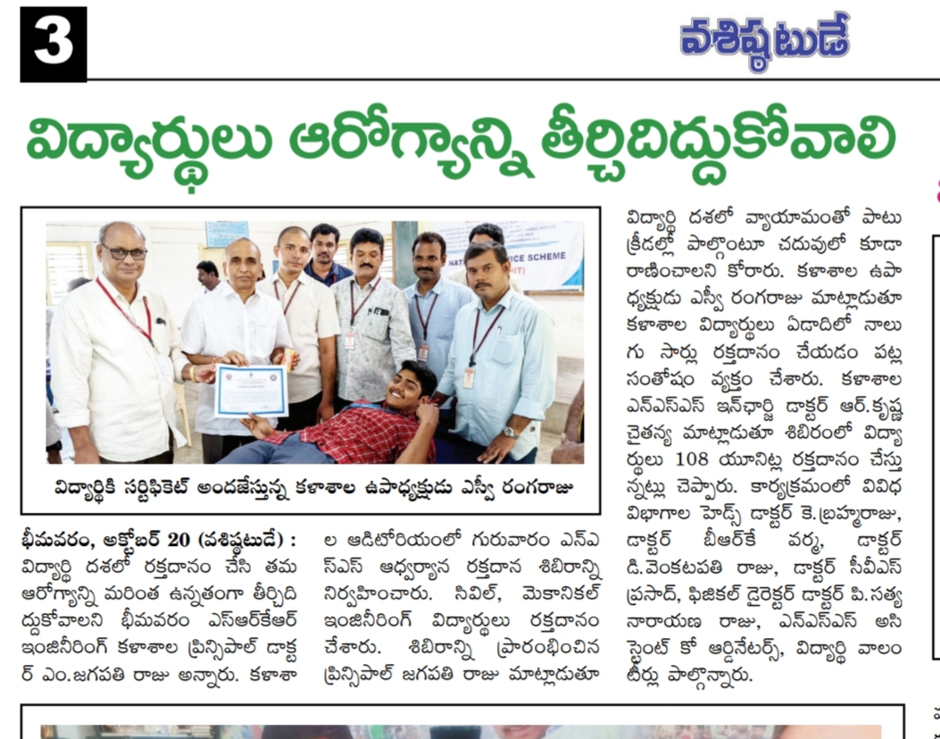 The NSS Unit at SRKR Engg College had conducted a Blood Donation Camp where the Civil and Mechanical Engineering Students had donated the blood for a noble cause. Principal of SRKR, Dr. M. Jagapathi Raju had said that students should inculcate the habit of donating the blood right from the childhood. Vice President of SRKR, Mr. SV Ranga Raju, College NSS Coordinator Dr. Krishna Chaitanya, HOD’s Dr. Brahma Raju, Dr. Varma, Dr. Venkatapathi Raju, Dr. Prasad, Physical Education Department staff etc. took part in this programme.