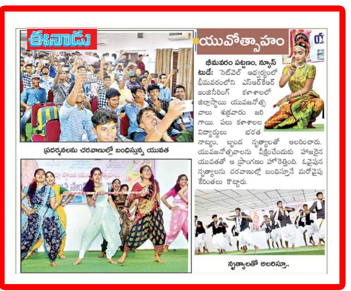 District Level 'Yuvajanotsav' by AP Govt was being held in a gradient manner at SRKR Engg College. Chief Guest of this occasion RDO Sri. Dasi Raju had said that these events play a major role in bringing out the hidden talents of the students. These events act as a stress buster for the students who are busy in their academics. Through these events students can come to know about various cultures and traditions of the country. CEO of Youth Services Mr. Mohan raj had said that the winners in these events will attend the selections at Guntur and the winners there will participate in the National Youth Day Celebrations on January 12th, 2023. Tahsildar Mr. Ravikumar, SRKR Vice President Mr. SV Ranga Raju, Principal Dr. Jagapathi Raju, Vice-Principal Dr. K. Brahma Raju graced this event.