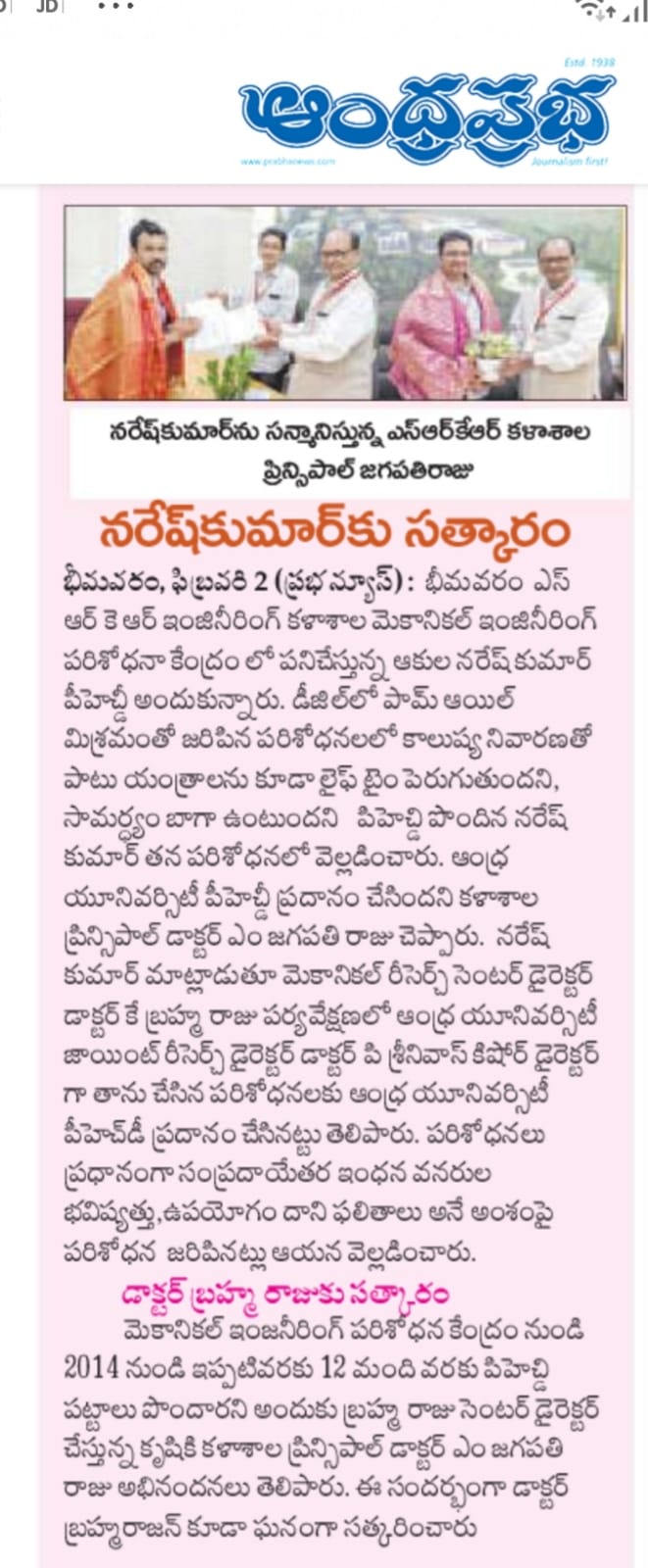 at SRKR Engg College had received doctorate from Andhra University, Principal Dr. M. Jagapathi Raju