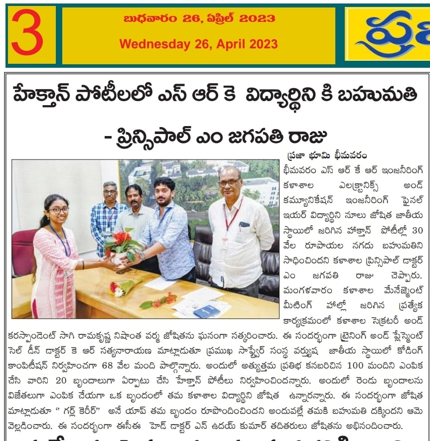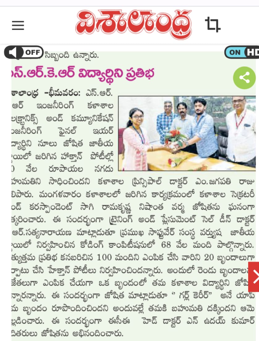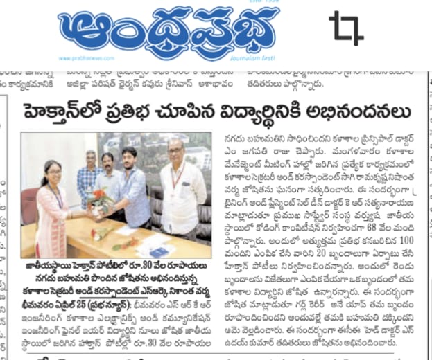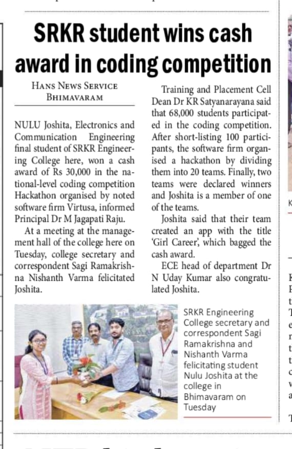 ECE final year student Ms. N. Joshitha had won National Level Hackathon and cash prize of 30K
