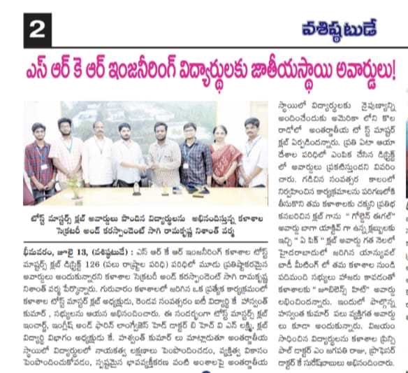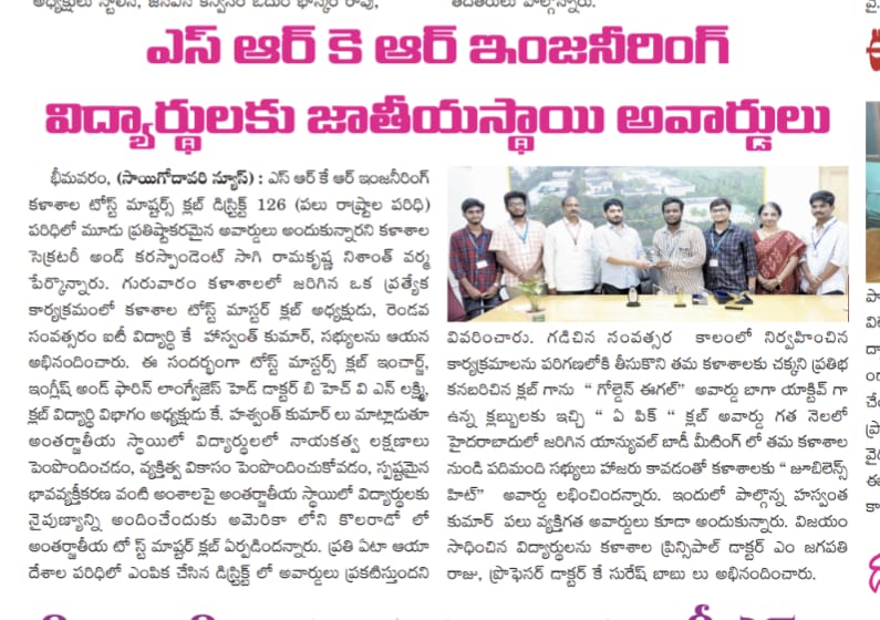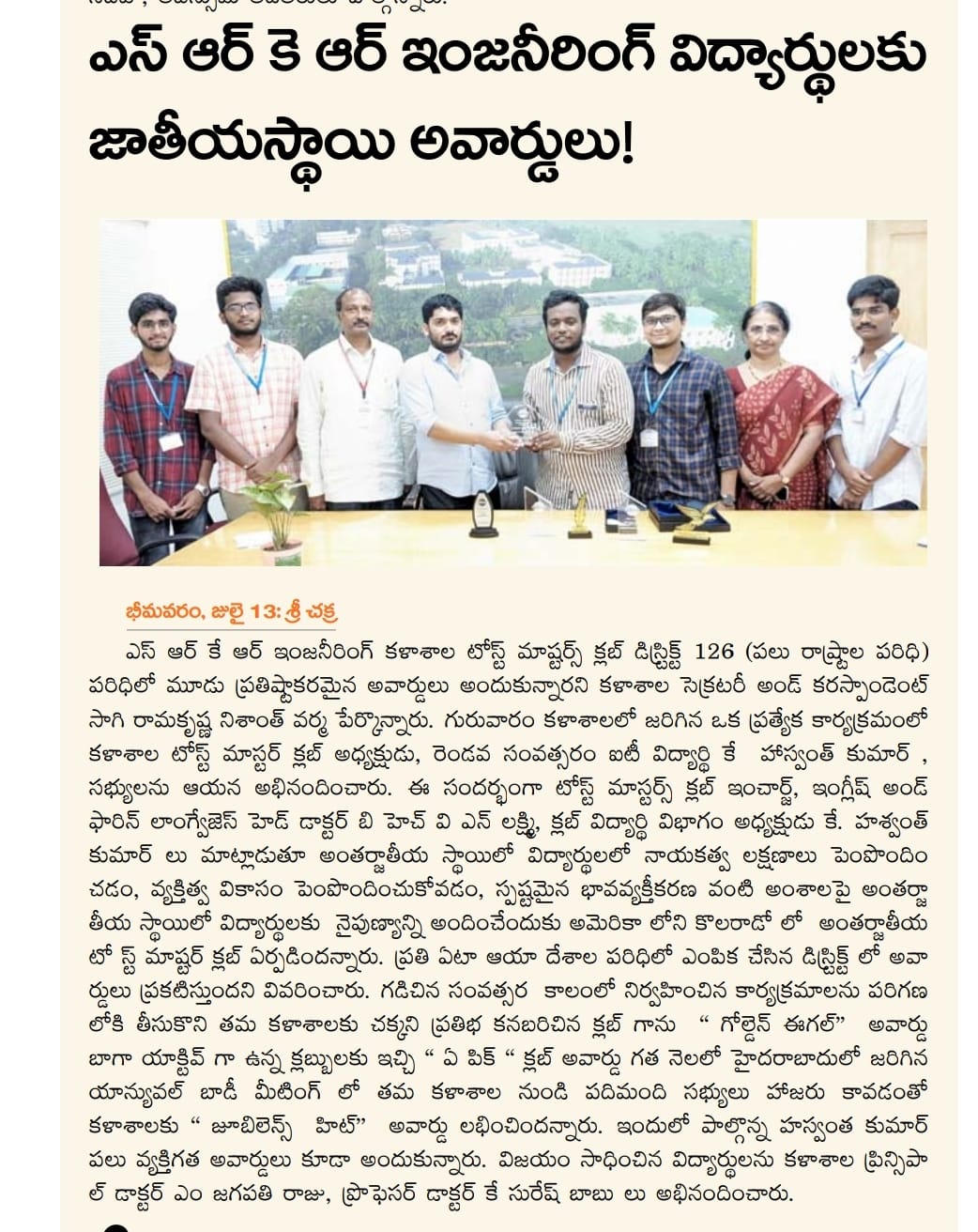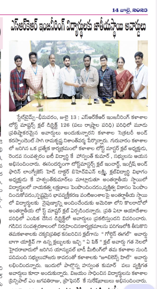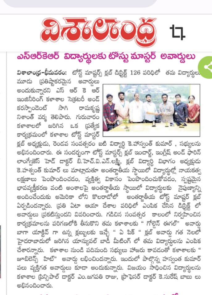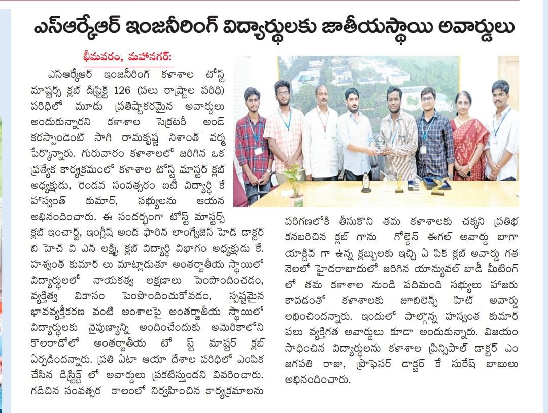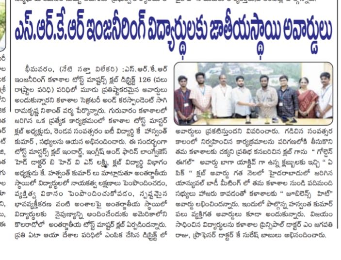 SRKR Toastmasters Club has won 3 prestigious awards at the National Level, Secretary and