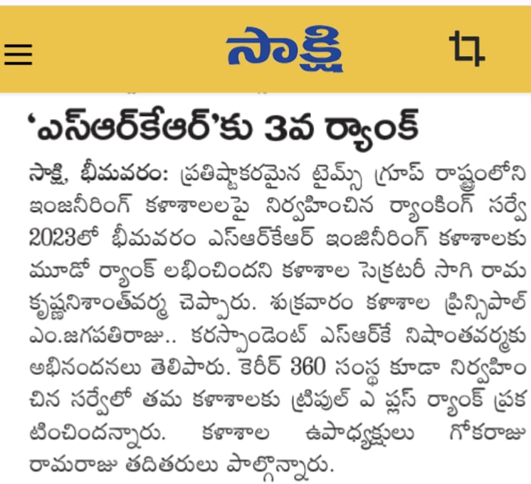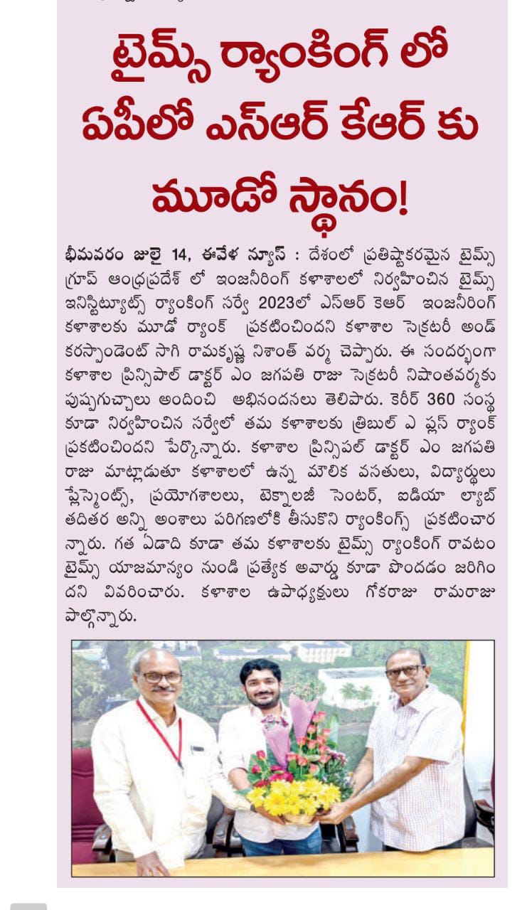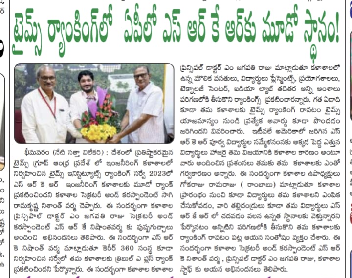 SRKR Engg College stood at 3 rd Rank in Times Rankings and AAA+ in Career 360 rankings, Principal of