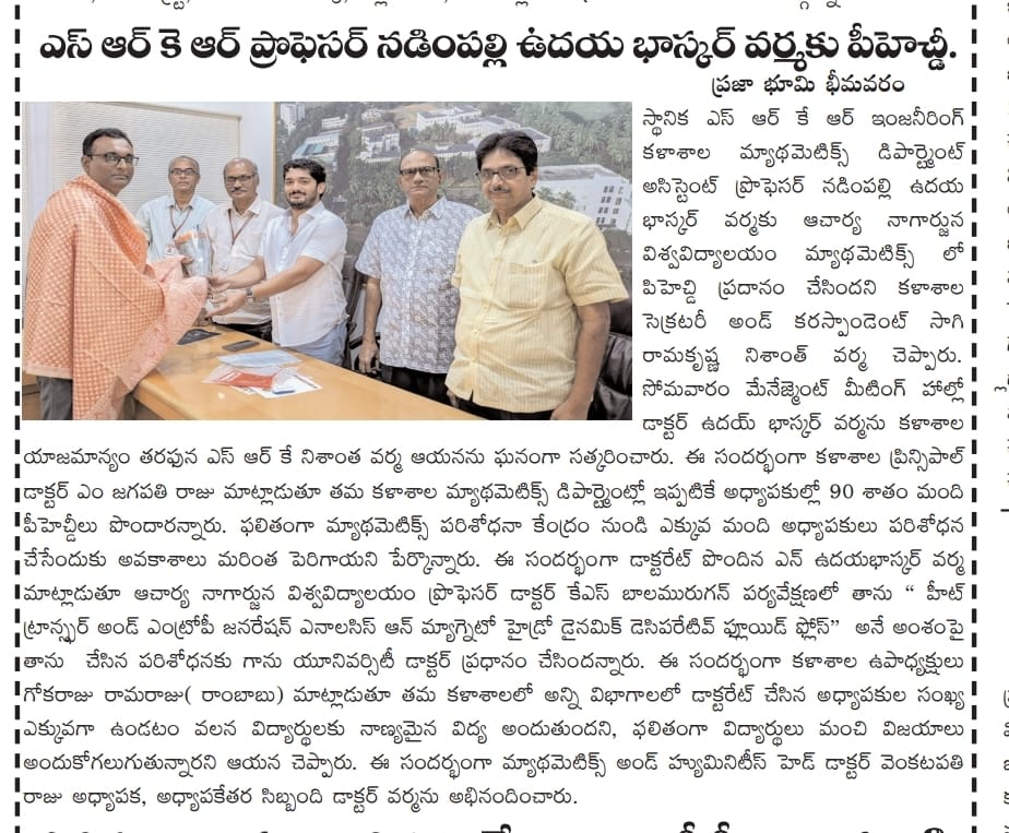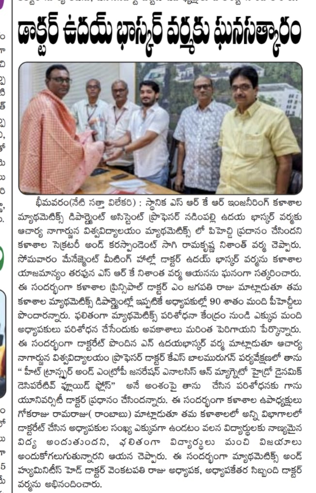 Mr. N. Uday Bhaskar Varma, Assistant Professor in the Dept of Mathematics and Humanities had