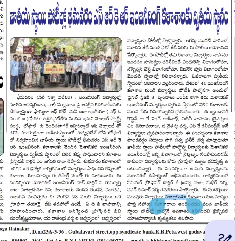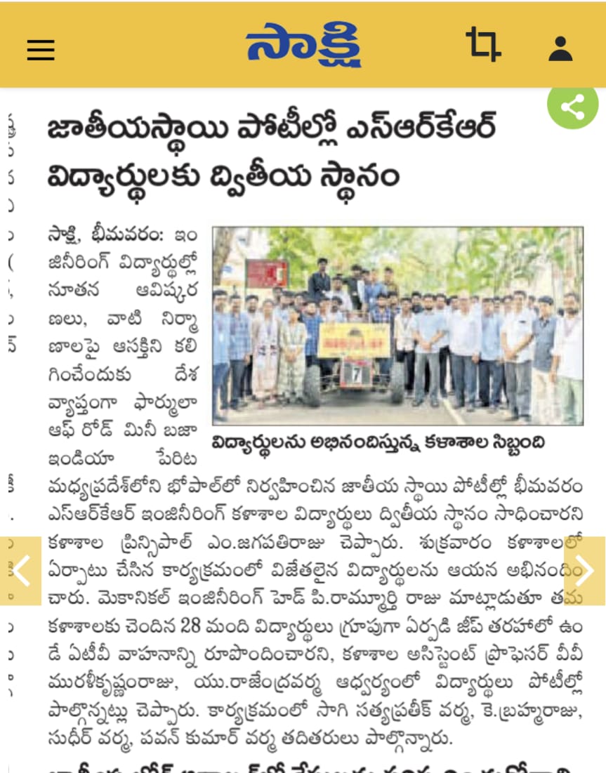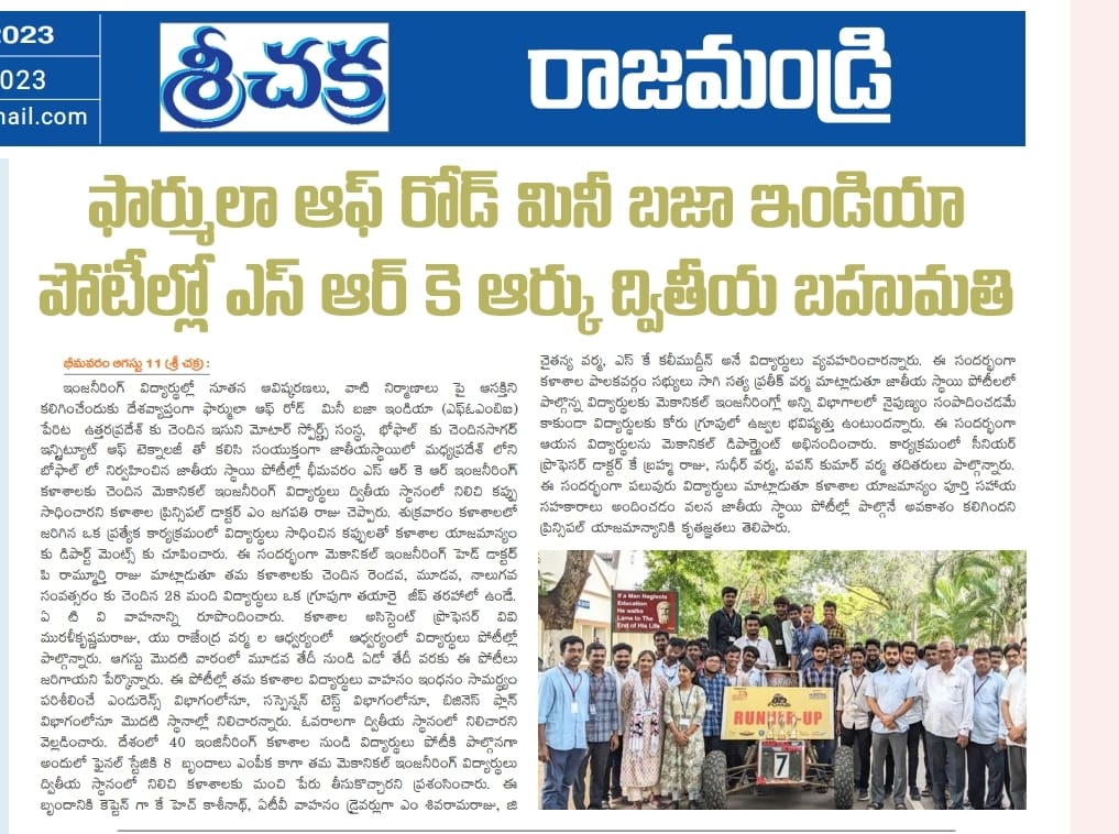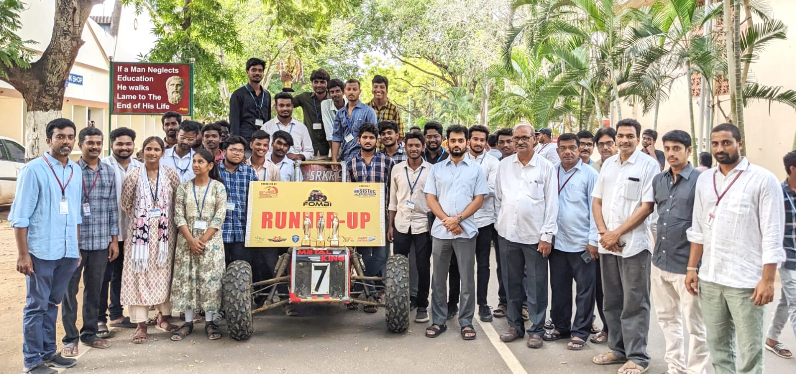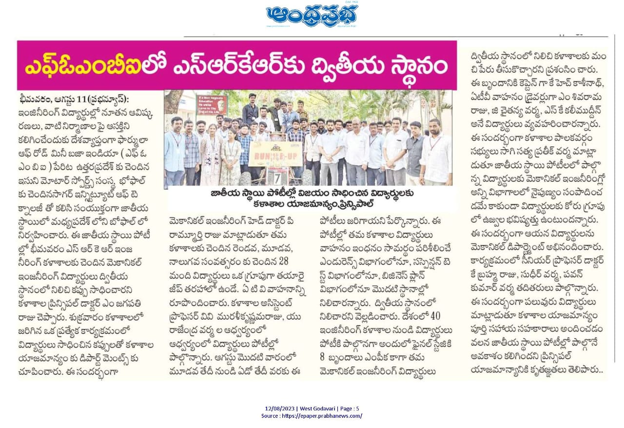 In a national competition in collaboration with Isuni Motor Sports Company and Sagar Institute of Technology in Bhopal, SRKR Engineering College's mechanical students secured second place. College Principal Dr. M. Jagapathi Raju announced this achievement and presented the trophy.