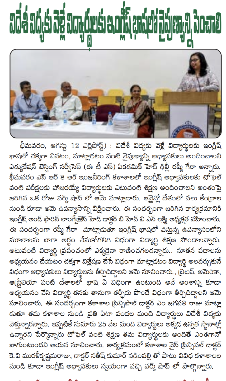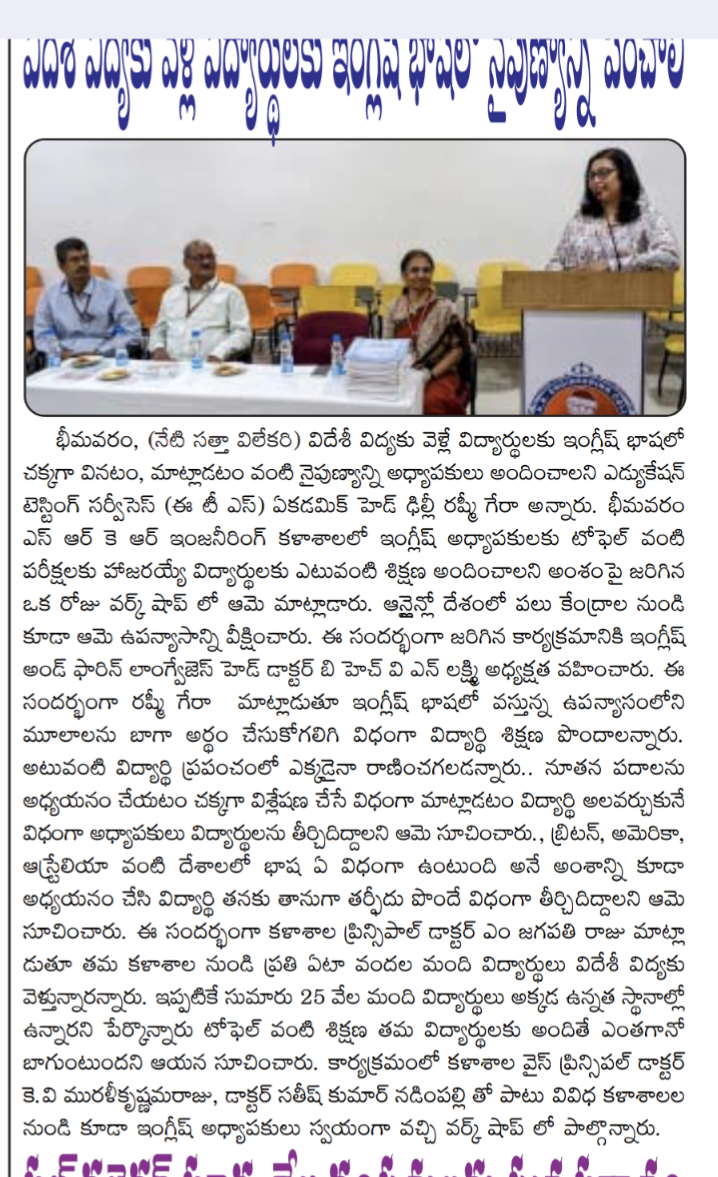 Rashmi Gera, an academic from the Education Testing Services (ETS) in Delhi, emphasized the importance of enhancing English language skills among students going abroad for higher education. She spoke on Saturday at a workshop organized by the English and Foreign Languages University (EFLU), where she addressed English teachers and students preparing for exams like TOEFL. She highlighted the significance of understanding the underlying principles in English language lectures and encouraged students to receive quality education. The program was attended by the Principal M. Jagapatiraju,Head of English and Foreign languages BH VN Lakshmi,Vice-Principal K.V. Muralikrishnamraju,N Satish Kumar and others.