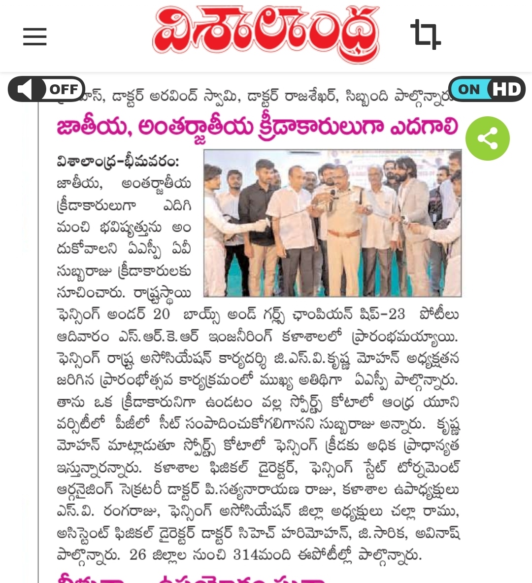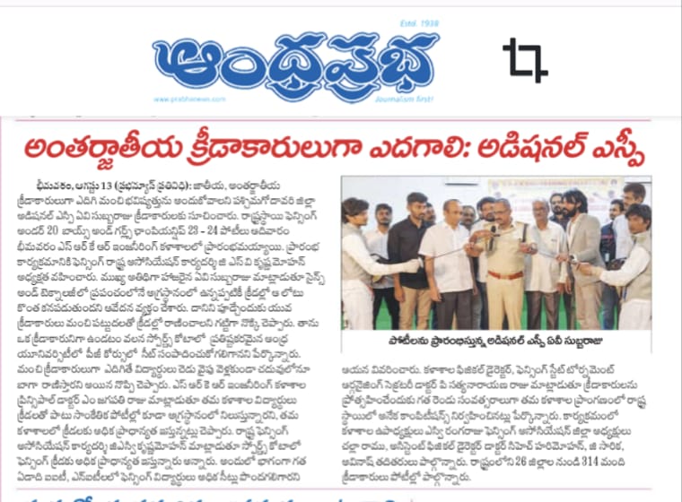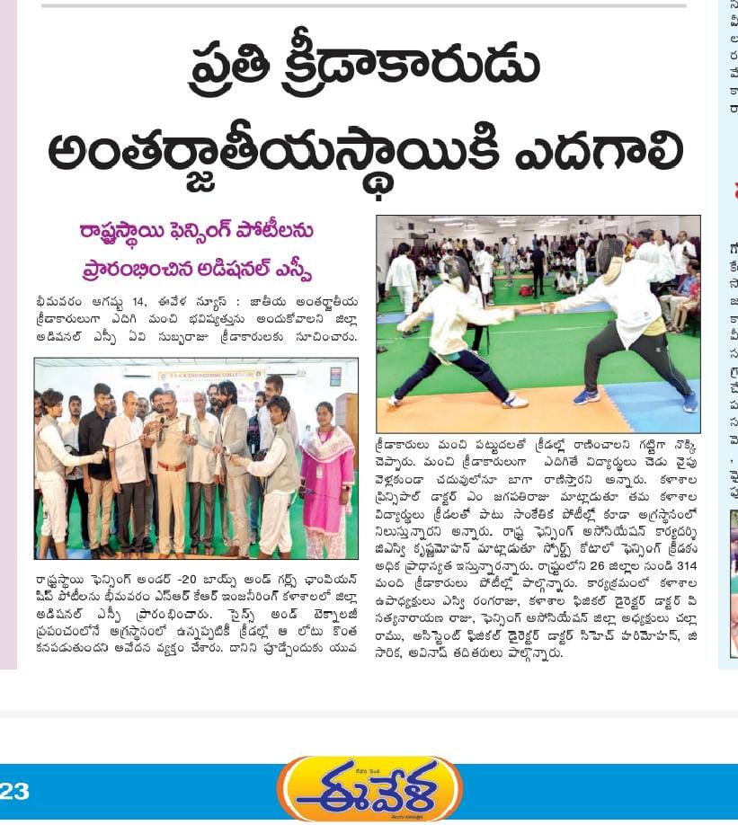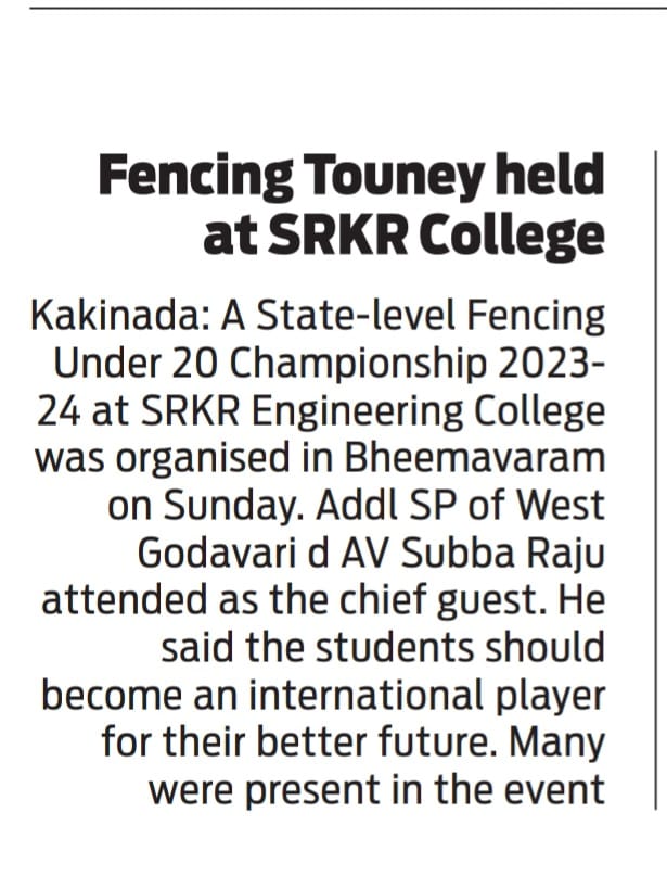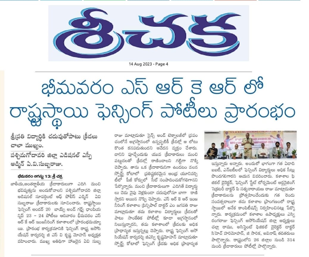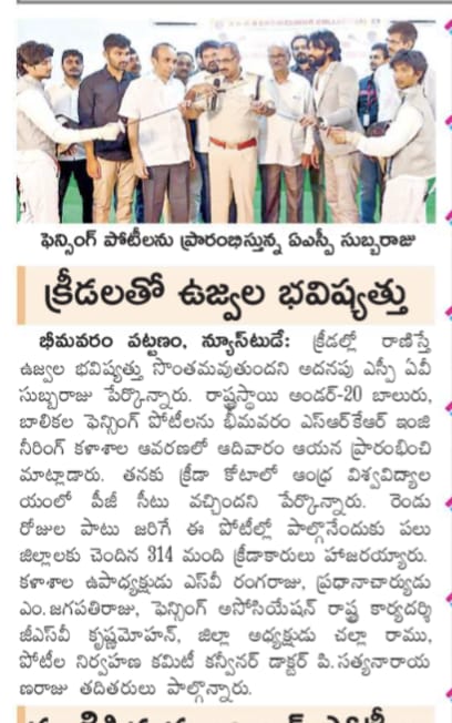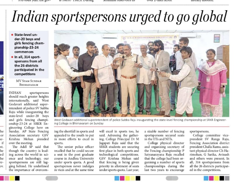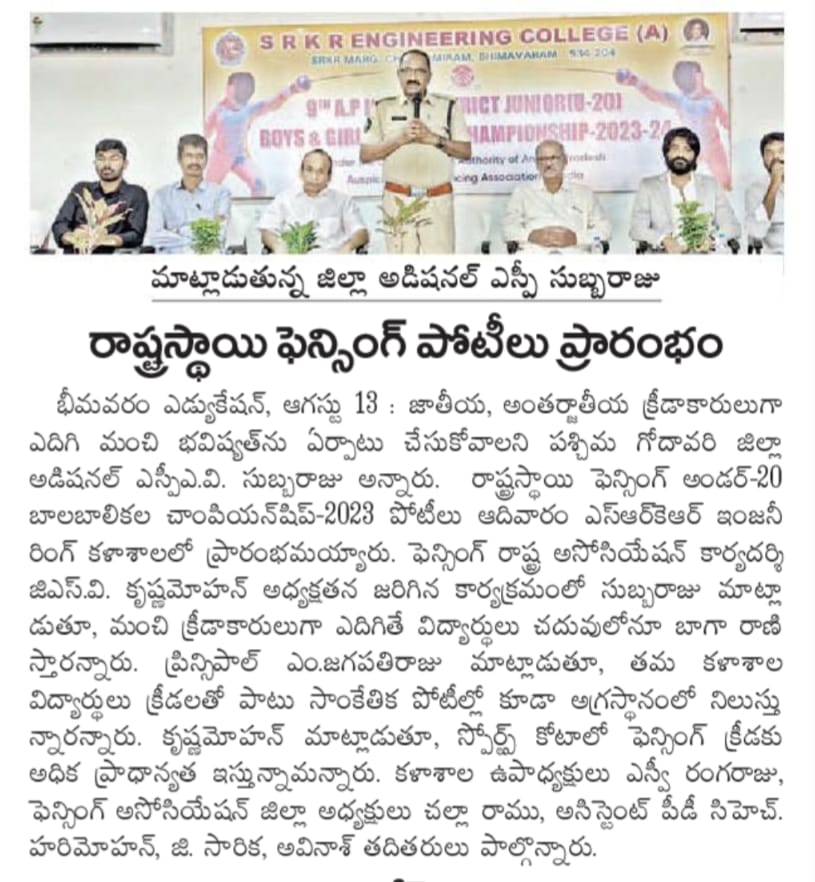 West Godavari District Additional S.P.A.V. Subbaraju said,the State Fencing Under-20 Boys and Girls Champion Ship-2023 competitions started on Sunday at SRKR Engineering College. Fencing State Association Secretary GS.V. In the program presided over by Krishnamohan, Subbaraju said that if the students grow up to be good sportsmen, they will do well in their studies. Principal M. Jagapathiraju said that the students of their college are topping in sports as well as technical competitions. Krishnamohan said that fencing sport is given high priority in the sports quota. College Vice President SV Rangaraju, Fencing Association District President Challa Ramu, Assistant PD CH. Harimohan, G. Sarika, Avinash