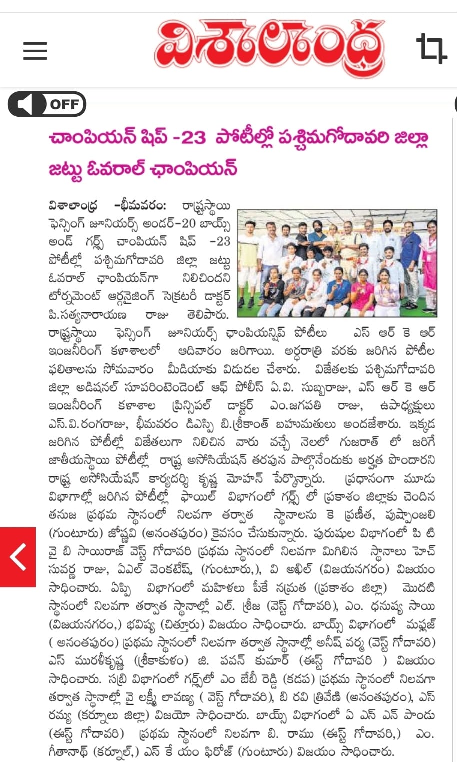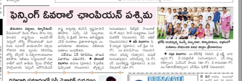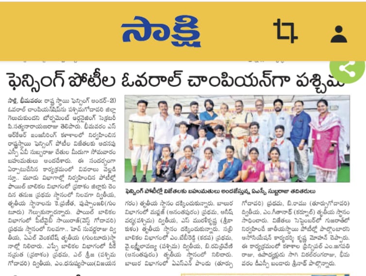 P. Satyanarayanaraju, the Tournament Organizing Secretary, announced West Godavari district's victory in the state-level under-20 fencing championship. Additional SC AV Subbaraju awarded winners at the competition held at Bhimavaram SRR Engineering College. Dina Tanuja from Prakasam secured first place in the foil girls category, with PT White Sairaj (West Godavari) taking the top spot in the foil girls category. In the boys' category, Mahlaj (Ananthapuram) secured first place. M. Baby Reddy (Kadapa) topped the Sakhi girls category, and ASN Pandu (East Godavari) claimed the first spot in another category. The winners will compete in the national-level competition in Gujarat in September. The event saw the participation of College Principal M. Jagapathi Raju, Vice President Sagi Vithalngaraju, and Bhima Varam DSC Bandaru Srinath.