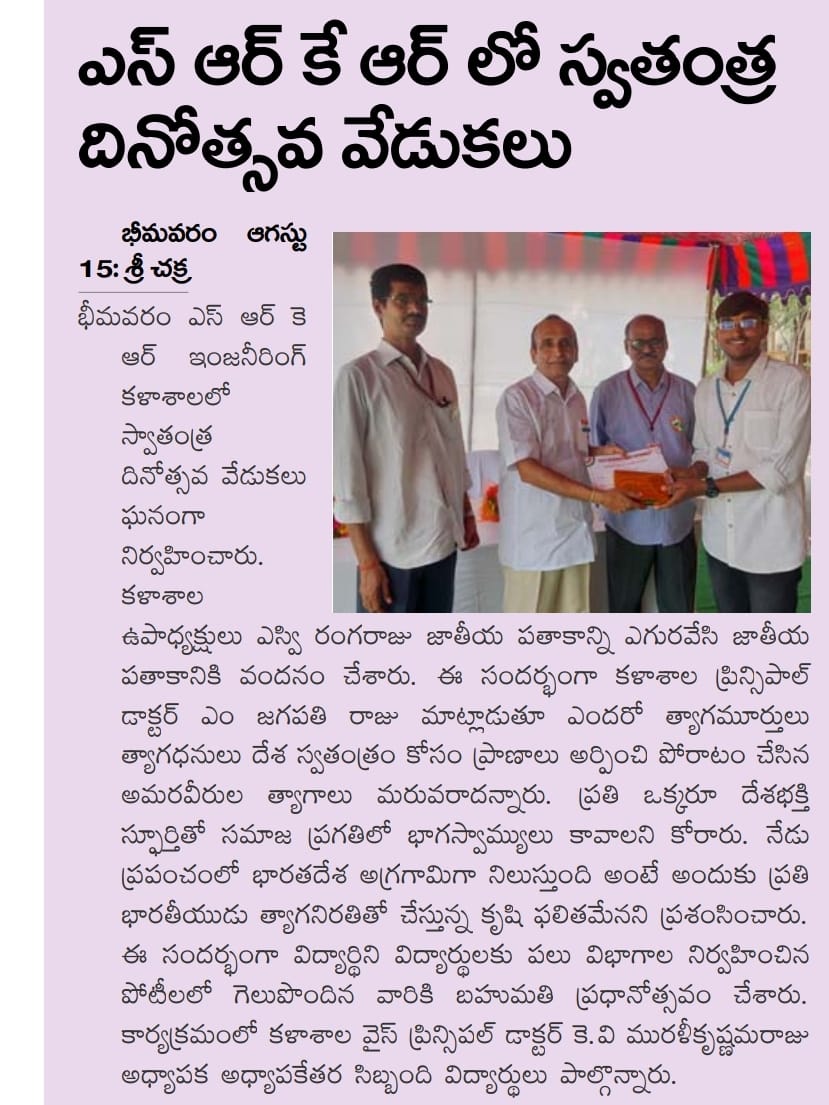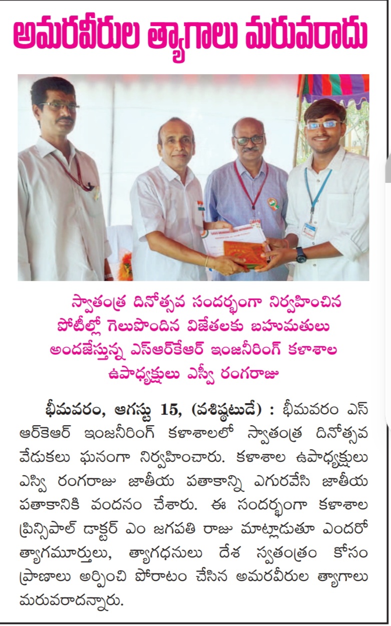 At SRKR Engineering College, Independence Day celebrations were organized with solemnity. Vice President SV Rangaraju hoisted the national flag, while the principal, Dr. M Jagapathi Raju, emphasized the importance of national sacrifices. A prize ceremony recognized competition winners, attended by Vice Principal Dr. KV Muralikrishnamaraju, faculty, non-teaching staff, and students participated in the program.