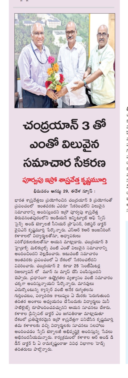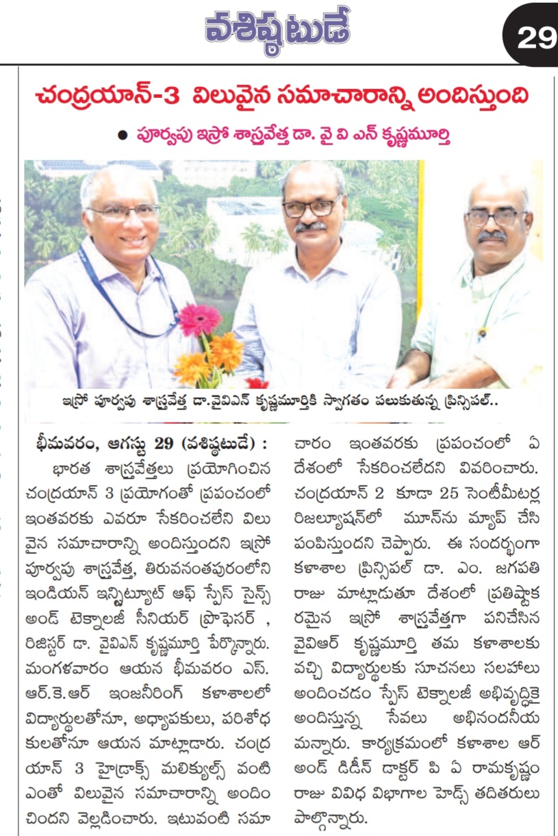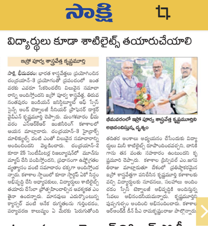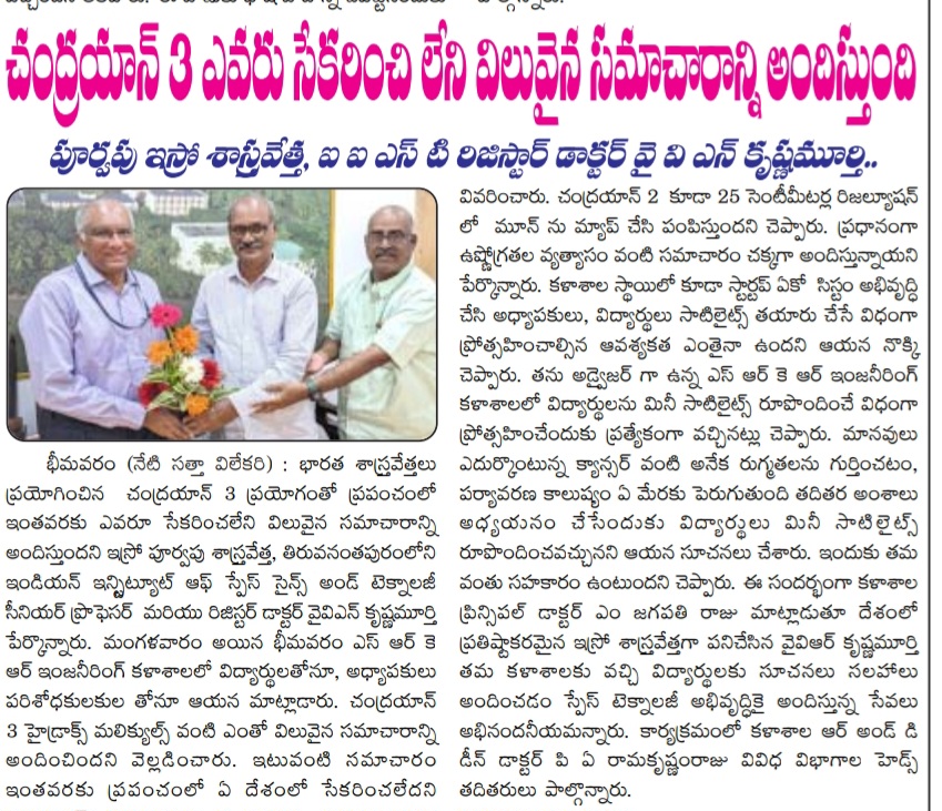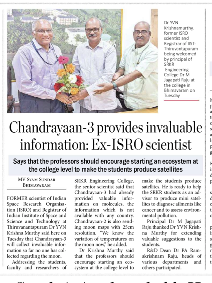 Dr. YVS Krishnamurthy, a former ISRO scientist and senior registrar at the Indian Institute of Space Science and Technology, Thiruvananthapuram, delivered a presentation at Bhimavaram S. R.K. R Engineering College. This event also featured the presence of Dr. M. Jagapathi Raju, the college's principal, Dr. PA Ramakrishnam Raju, the college's R&D Dean, department heads, and dignitaries.