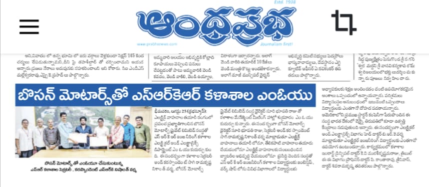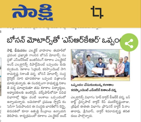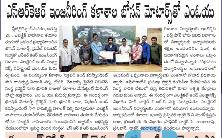 SRKR Engineering College recently formalized a partnership with Bosan Motors. The agreement was executed by Mr. Sagi Ramakrishna Nishant Varma, the Secretary and Correspondent of SRKR Engineering College, and Mr. Suri Bhupathiraju, the Director of Bosan Motors.