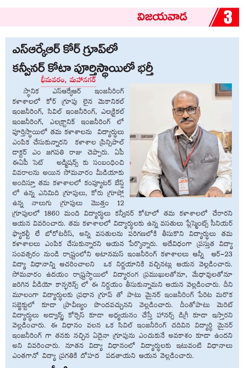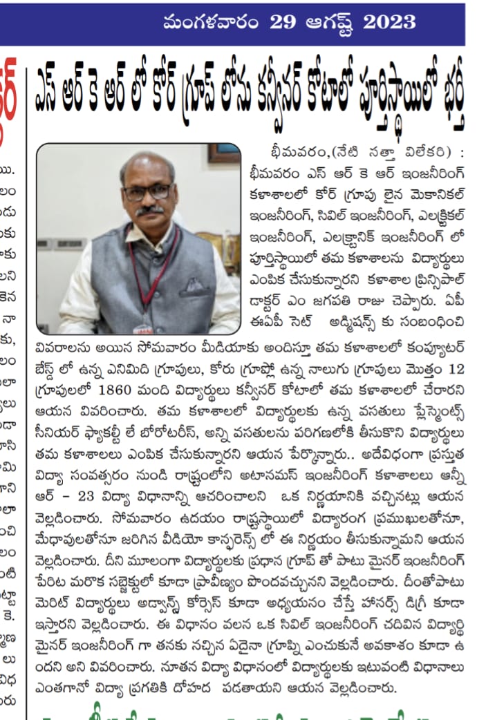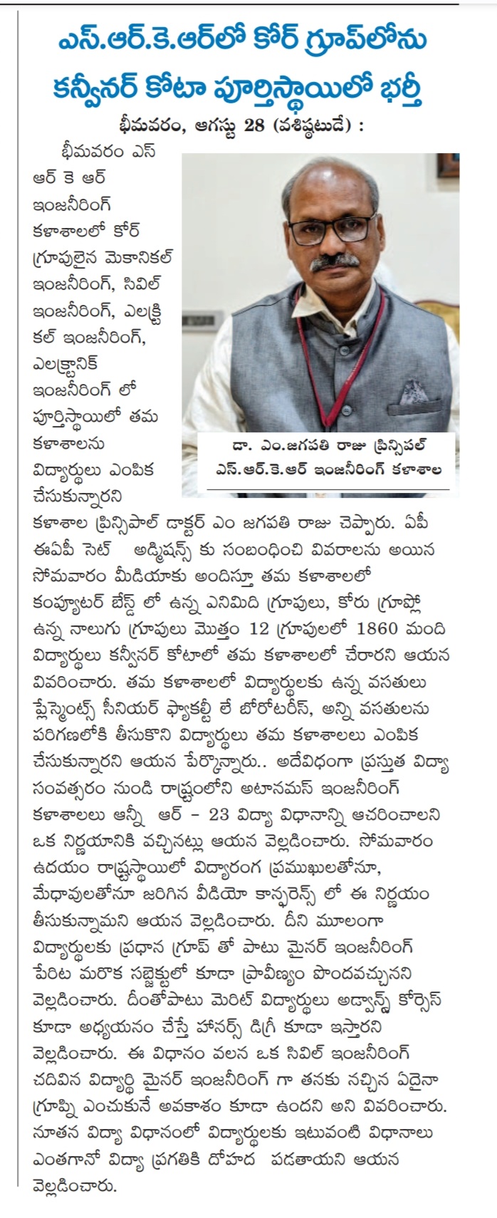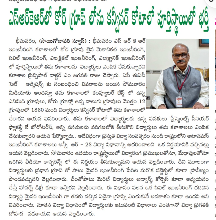 Dr. M. Jagapathi Raju Principal of SRKR, reported that 1860 students have been admitted to the institution's core engineering programs, encompassing Mechanical Engineering, Civil Engineering, Electrical Engineering, and Electronic Engineering. Additionally, it was revealed that the R-23 education system has been unanimously adopted by all autonomous engineering colleges in the state, permitting students to concurrently pursue minor engineering subjects and potentially earn honors degrees for advanced courses. These developments are designed to enhance the educational experience within the new system.