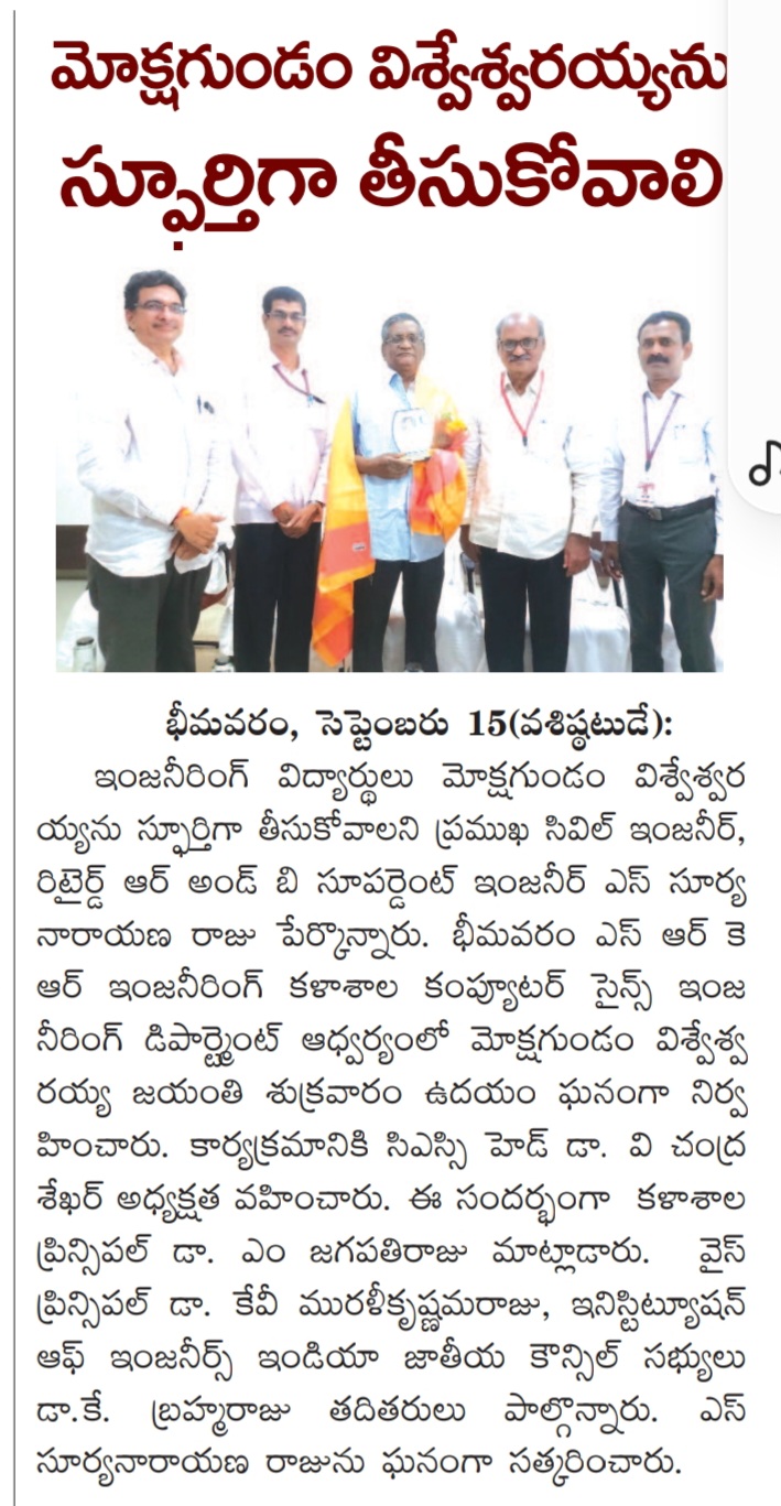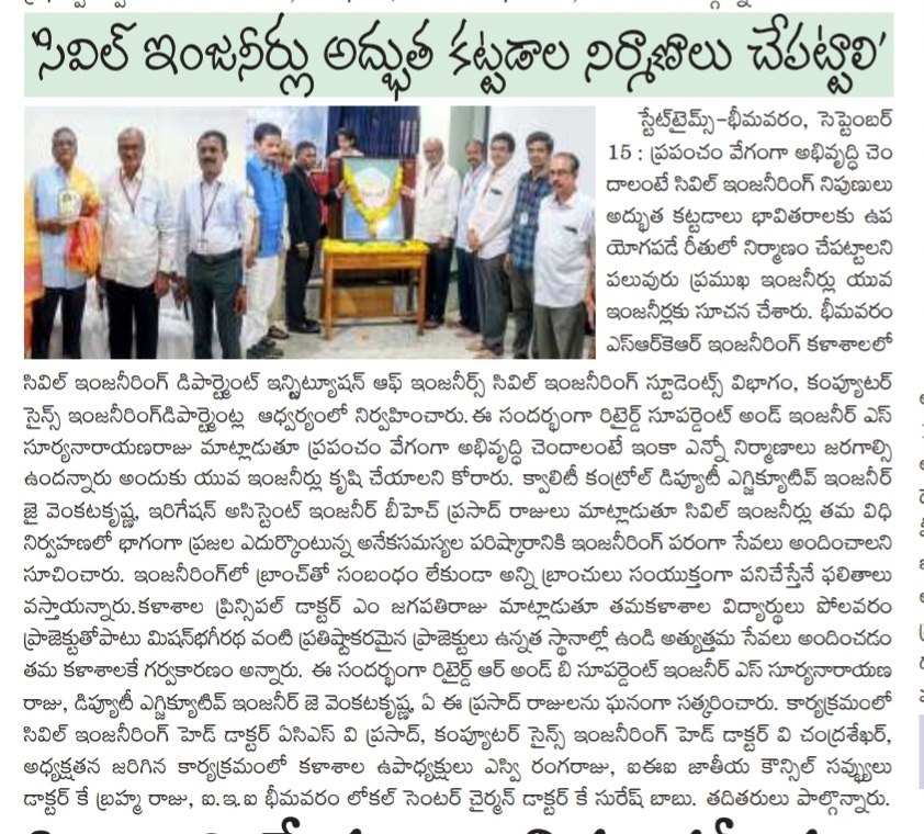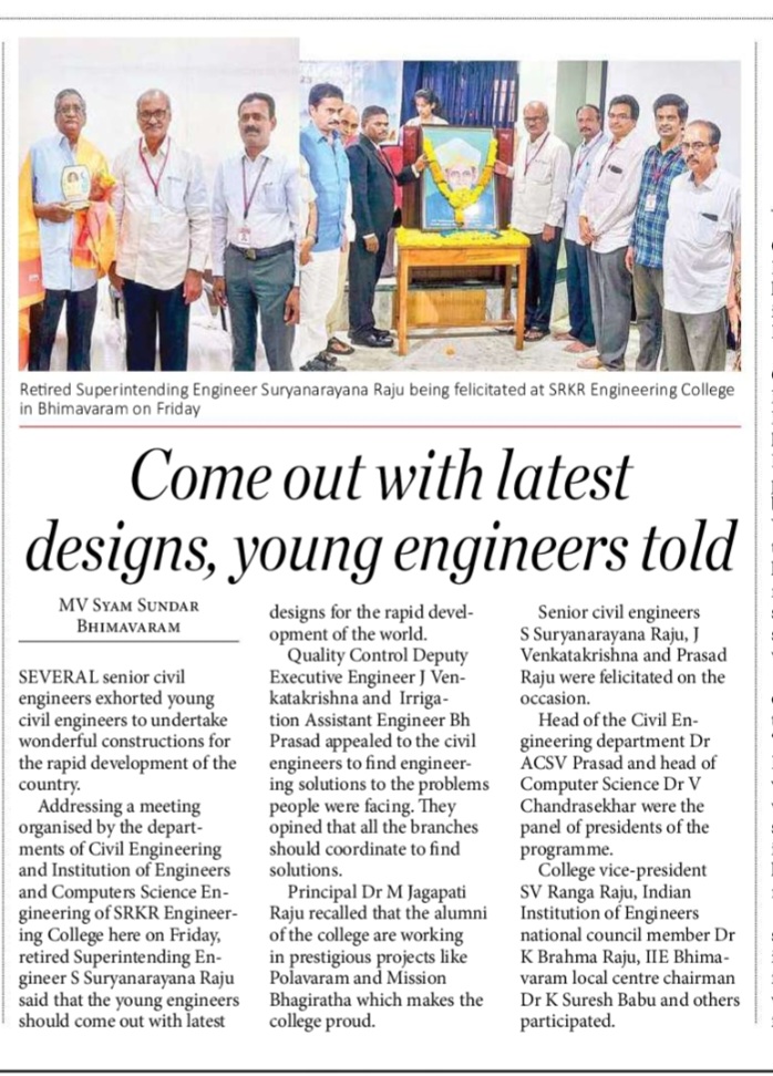 Workshop on engineering day held at SRKR, the significance of civil engineering in global development was underscored by esteemed engineers. Retired superintendent and engineer S. Suryanarayanaraju encouraged the active involvement of young engineers in significant construction projects. Emphasis on the role of civil engineers in addressing societal challenges was provided by Quality Control Deputy Executive Engineer Jai Venkatakrishna and Irrigation Assistant Engineer BH Prasad Rajulu. Dr. M. Jagapathiraju, the college's principal, expressed satisfaction with the remarkable achievements of college students in prestigious projects. Distinguished participants in the workshop included Dr. ACS V. Prasad, Dr. V. Chandrasekhar, SV Rangaraju, Dr. K. Brahma Raju, and Dr. K. Suresh Babu.