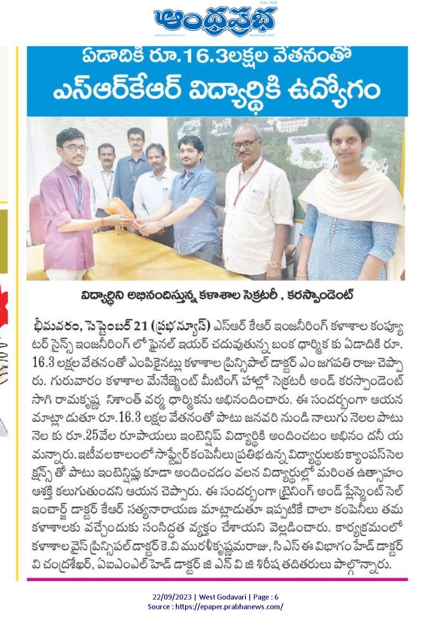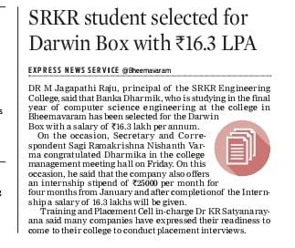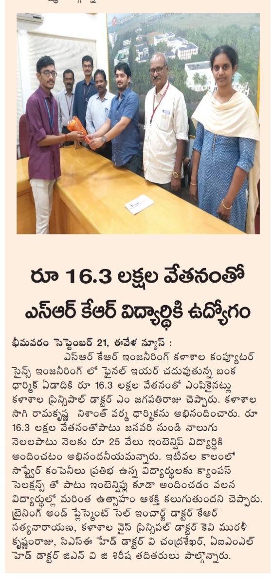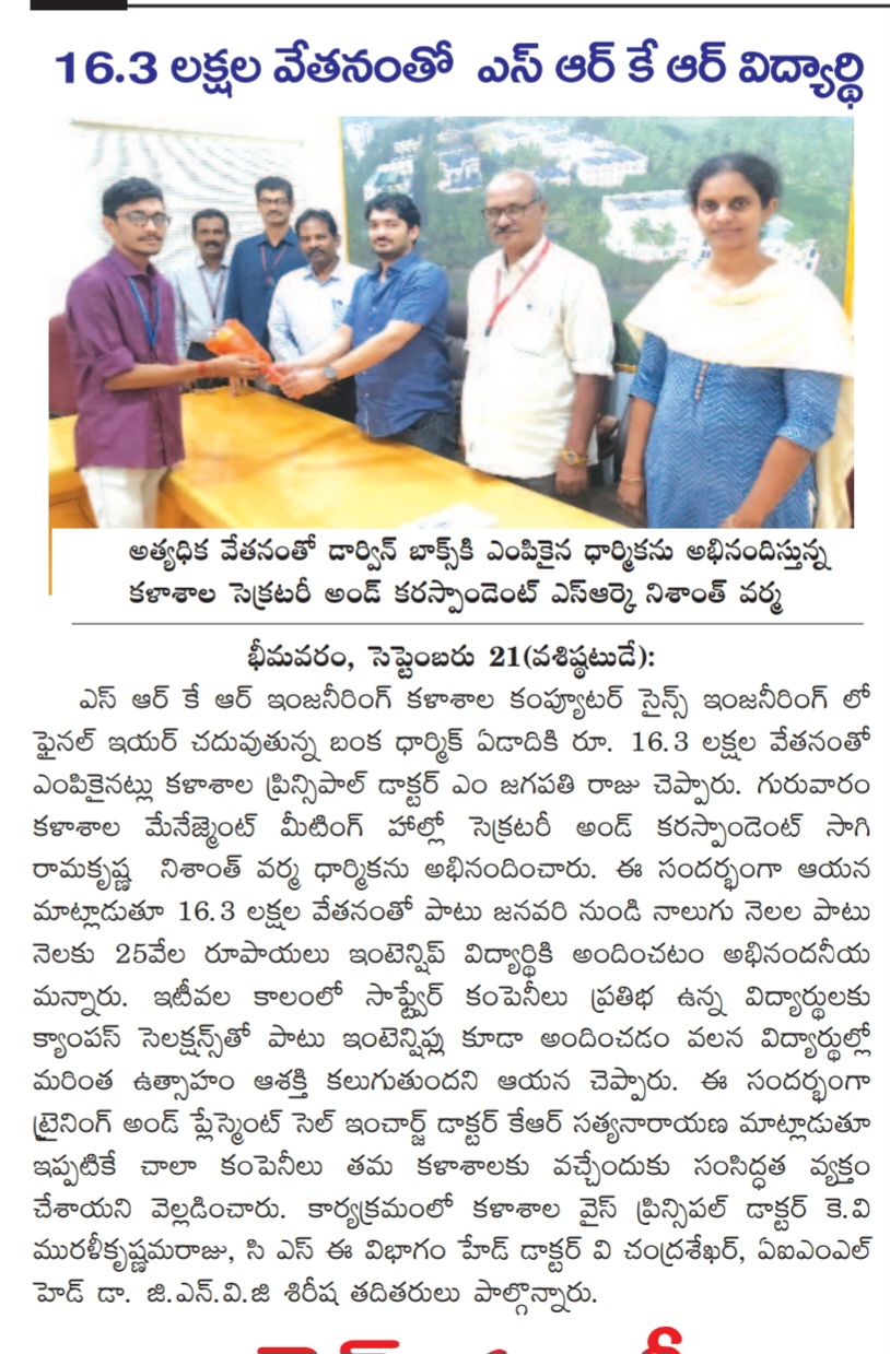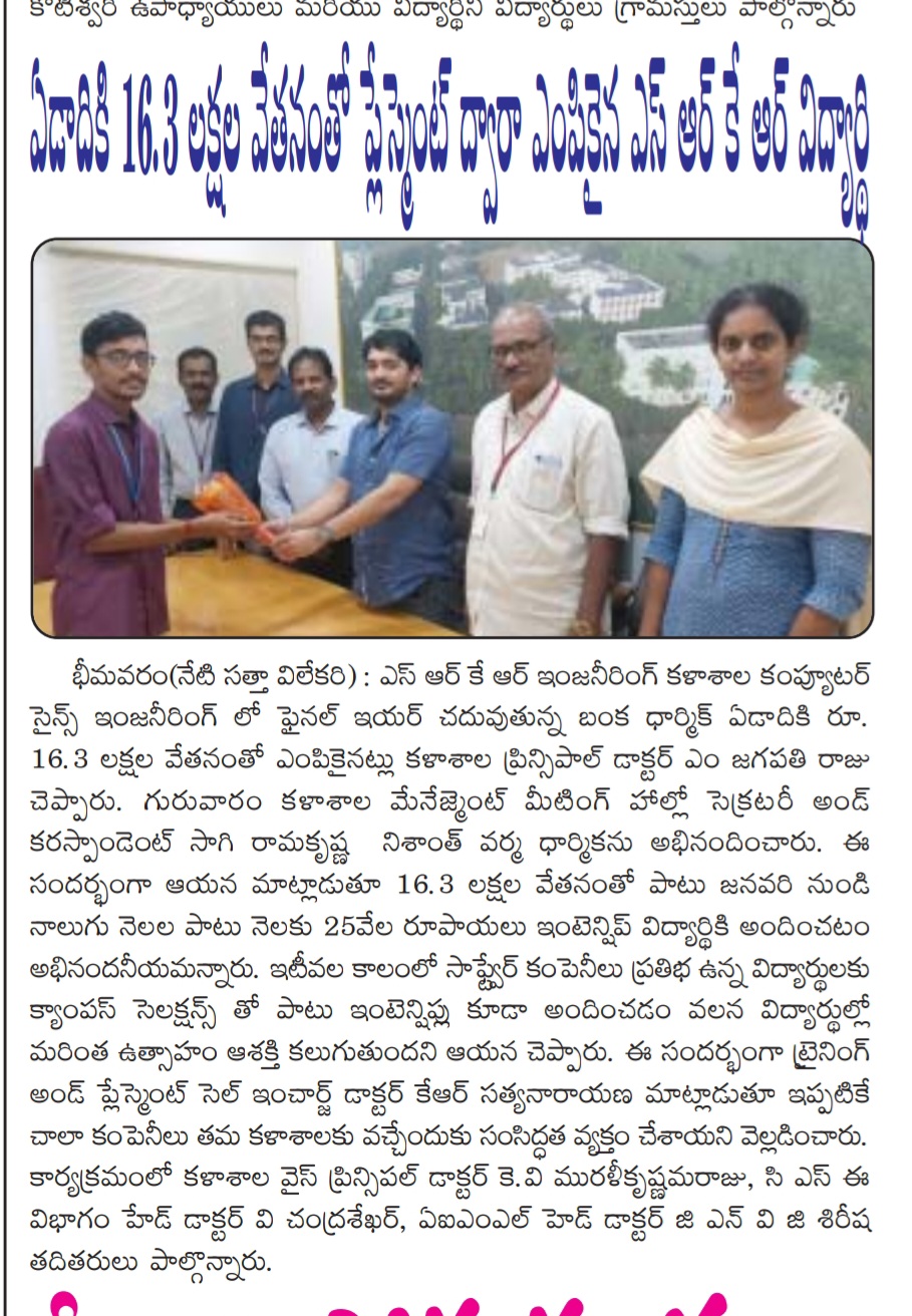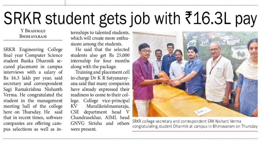 Banka Dharmik, 4/4 CSE student at SRKR , has secured a position with a salary of Rs. 16.3LPA, as announced by Dr. M. Jagapathi Raju, the college's Principal. Secretary and Correspondent Sagi Ramakrishna Nishanth Varma extended congratulations in a college management meeting. Dr. KR Satyanarayana, Incharge of the T&P Cell, noted the growing interest from several companies in recruiting from the college. College Vice Principal Dr. KV Muralikrishnamaraju, Dr. V. Chandrasekhar Head of CSE Department, Dr. G.N.V. G. Sirisha Head of AIML, and others were present.