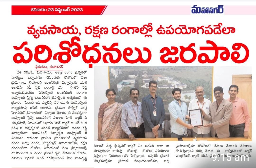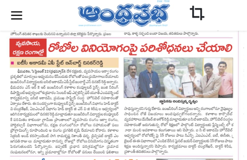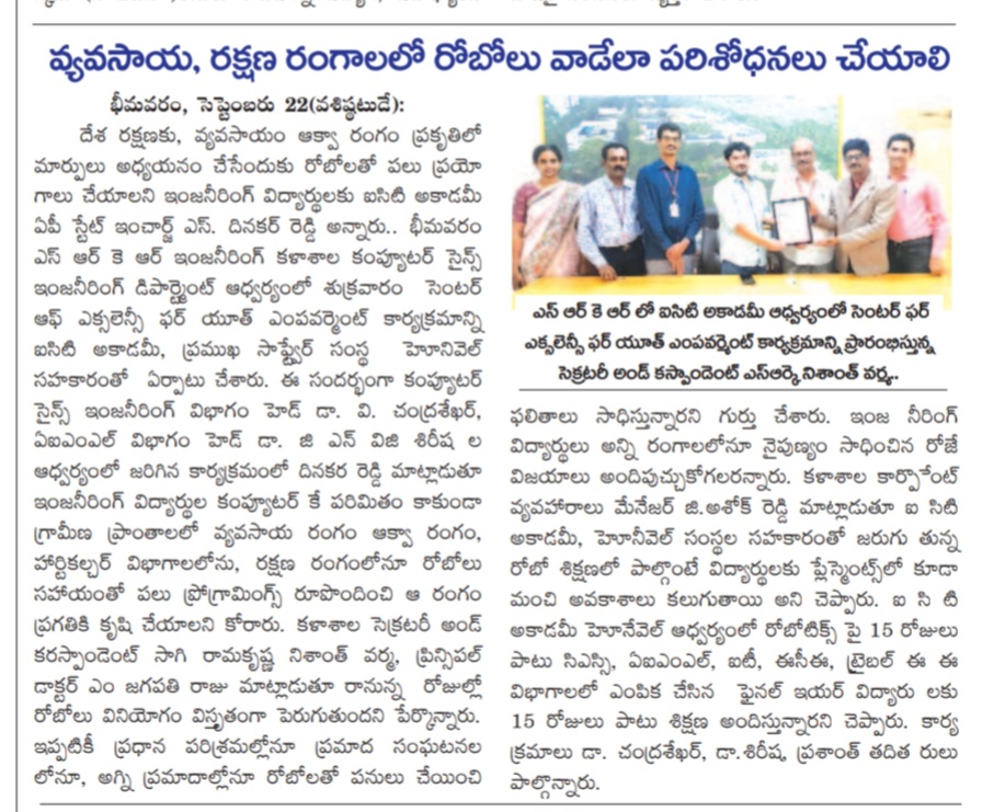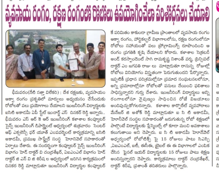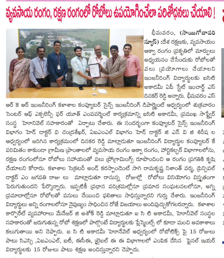 During the Center of Excellence for Youth Empowerment program at Bhimavaram SRKR Engineering College, ICT Academy AP State Incharge S Dinakar Reddy encouraged engineering students to explore robotics for studying natural changes in defense and agriculture. The event, in collaboration with ICT Academy and Honeywell, was overseen by Dr. V. Chandrasekhar, Head of Computer Science Engineering Department, and Dr. G. N. V. G. Sirisha, Head of AIML Department. College Secretary Sagi Ramakrishna Nishant Varma and Principal Dr. M Jagapathi Raju emphasized the growing role of robots in various industries. Corporate Affairs Manager G Ashok Reddy highlighted the value of the robot training program for enhancing students' placement opportunities.