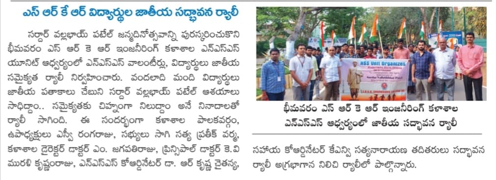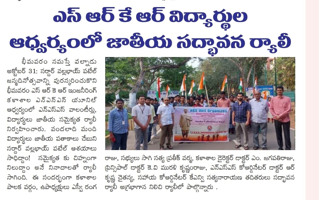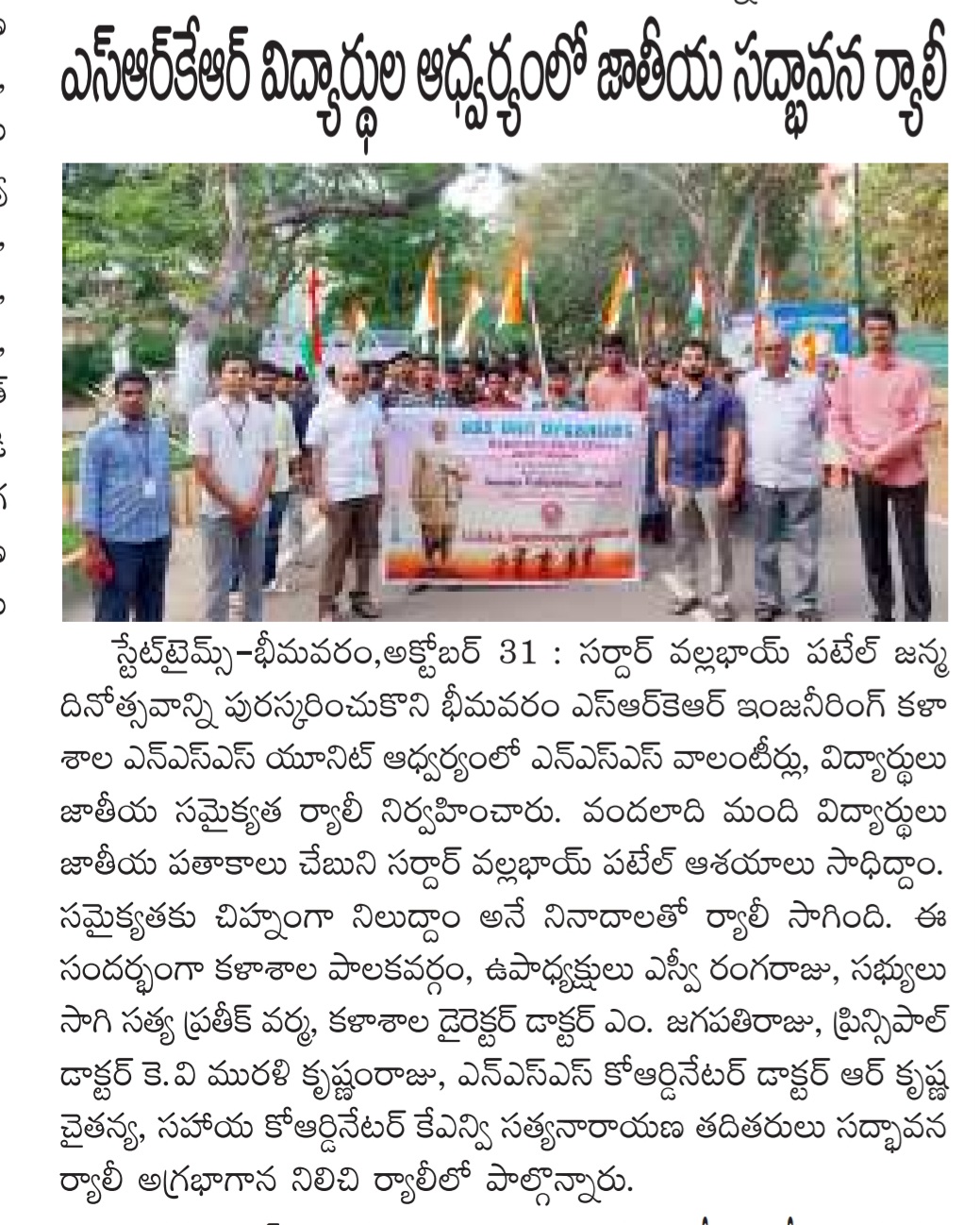 In commemoration of the birth anniversary of the Iron Man of India, Sardar Vallabhbhai Patel, the National Service Scheme (NSS) students of SRKR Engineering College organized a vibrant rally on our campus. With unwavering enthusiasm and a deep sense of patriotism, the NSS volunteers gathered to pay tribute to this visionary leader, who played a pivotal role in the integration of our nation. The rally, characterized by spirited marches and patriotic fervor, aimed to celebrate the values of unity, integrity, and leadership that Sardar Patel exemplified throughout his life. The event not only served as a fitting tribute to Sardar Vallabhbhai Patel but also instilled a sense of national pride and unity among the participants. It reflects our dedication to fostering not just academic excellence but also a deep sense of responsibility and patriotism among our students.