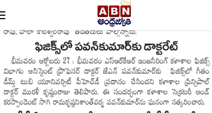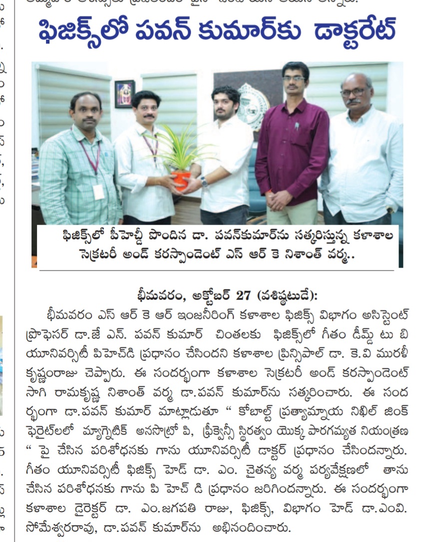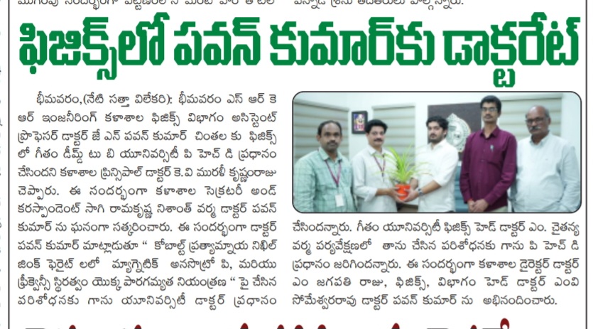 We are delighted to announce that Dr. Pavan Kumar, an esteemed member of our faculty at SRKR Engineering College, has recently achieved a significant milestone in his academic journey. Dr. Kumar, who serves as an Assistant Professor in the Department of Physics, has been awarded a Doctorate from GITAM Deemed to be University. His dedication to the field of physics and commitment to scholarly excellence have culminated in this prestigious achievement. Dr. Kumar's accomplishment not only reflects his individual brilliance but also adds to the academic prowess of our institution. We take pride in having such accomplished educators who contribute to the intellectual vibrancy of SRKR Engineering College. We extend our heartiest congratulations to Dr. Pavan Kumar on this remarkable accomplishment and look forward to his continued contributions to the academic community.