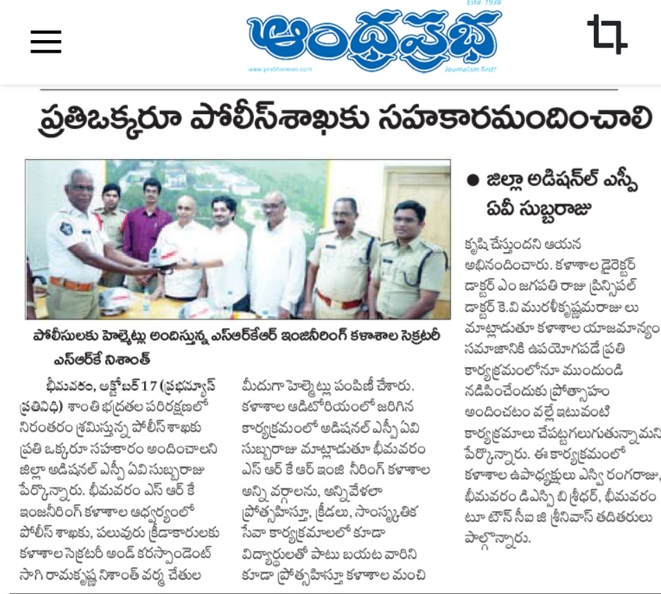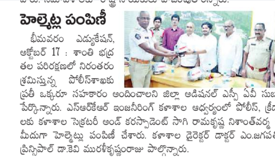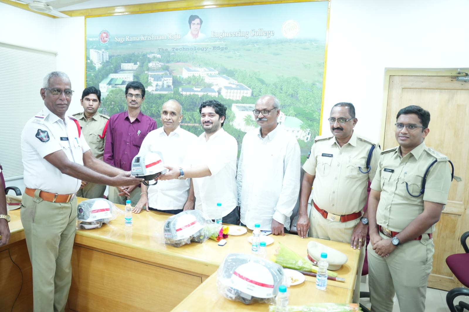 In a proactive initiative to support the tireless efforts of the police department in maintaining peace, SRkR Engineering College, under the leadership of College Secretary and Correspondent Sagi Ramakrishna Nishant Verma, organized a helmet distribution event in collaboration with the District Police.