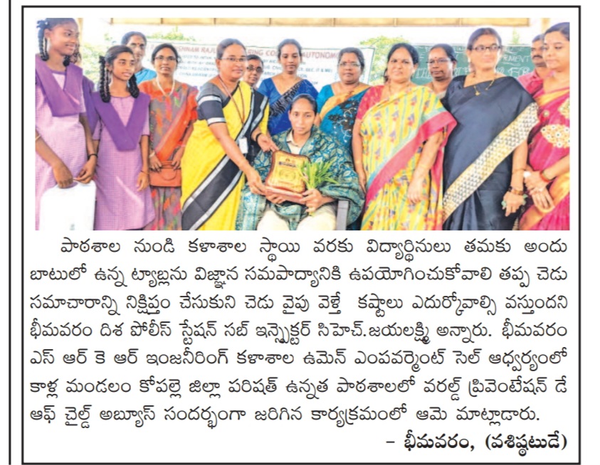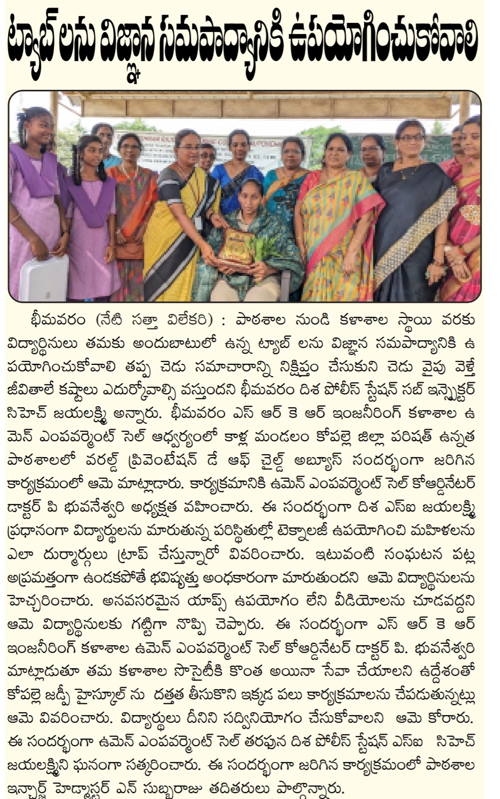 C.H. Jayalakshmi, Sub Inspector of Bhimavaram Police Station, underscored the importance of responsible use of tabs provided to students from school to college levels. She emphasized that these tabs are valuable tools for educational advancement, urging students to refrain from misuse or negligence that may lead to challenges. The insightful session took place during a program organized in Kalla Mandal Kopelle High School, supported by the Women Empowerment Cell of S.R.K.R Engineering College, on the occasion of the World Prevention Day of Child Abuse. The valuable insights shared by C.H. Jayalakshmi serve as a reminder of the significance of responsible technology usage in the academic journey of our students.