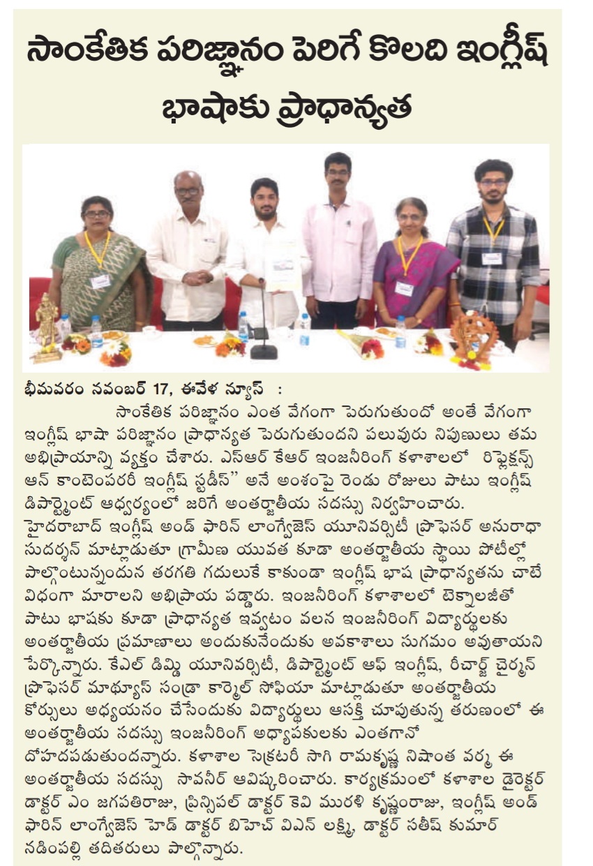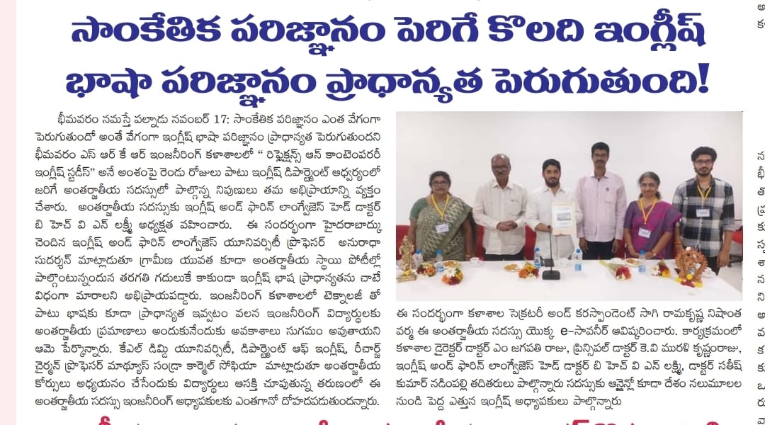 The college organized a two-day international conference named "Reflections on Contemporary English Studies." Experts from different academic backgrounds came together to discuss the increasing importance of English skills alongside technological advancements.Dr. BHVS Lakshmi, Head of English and Foreign Languages, led the conference, stressing the rising significance of English proficiency in our tech-driven world. Discussions focused on the crucial role of English in the face of advancing technology.Professor Anuradha Sudarshan from the University of Hyderabad highlighted the need for a comprehensive approach to English education. She pointed out that rural youth engaging in global competitions require English skills not only in classrooms but also in engineering colleges. Prioritizing language skills, she noted, can open opportunities for engineering students to meet global standards.