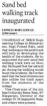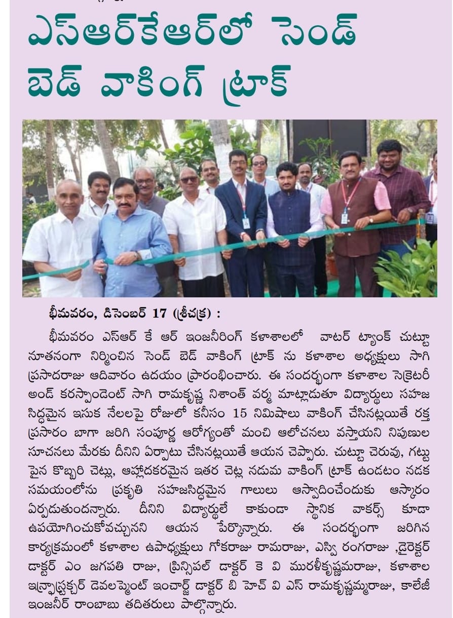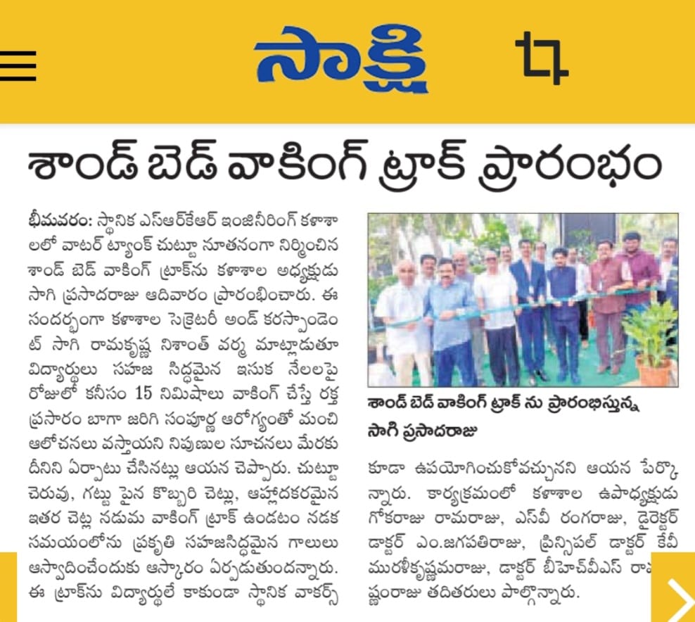College president Sri Sagi Prasadaraju garu inaugurated the newly constructed sand bed walking track around the water tank in the local SRKR Engineering College on Sunday. On this occasion, College Secretary and Correspondent Sagi Ramakrishna Nishant Varma garu said that this was arranged as per the suggestions of experts that if the students walk for at least 15 minutes a day on the naturally prepared sandy soil, the blood circulation will be good and they will have good thoughts with perfect health. There is a pond around, coconut trees on the embankment and a walking track in the middle of other pleasant trees. This track is used not only by students but also by local walkers