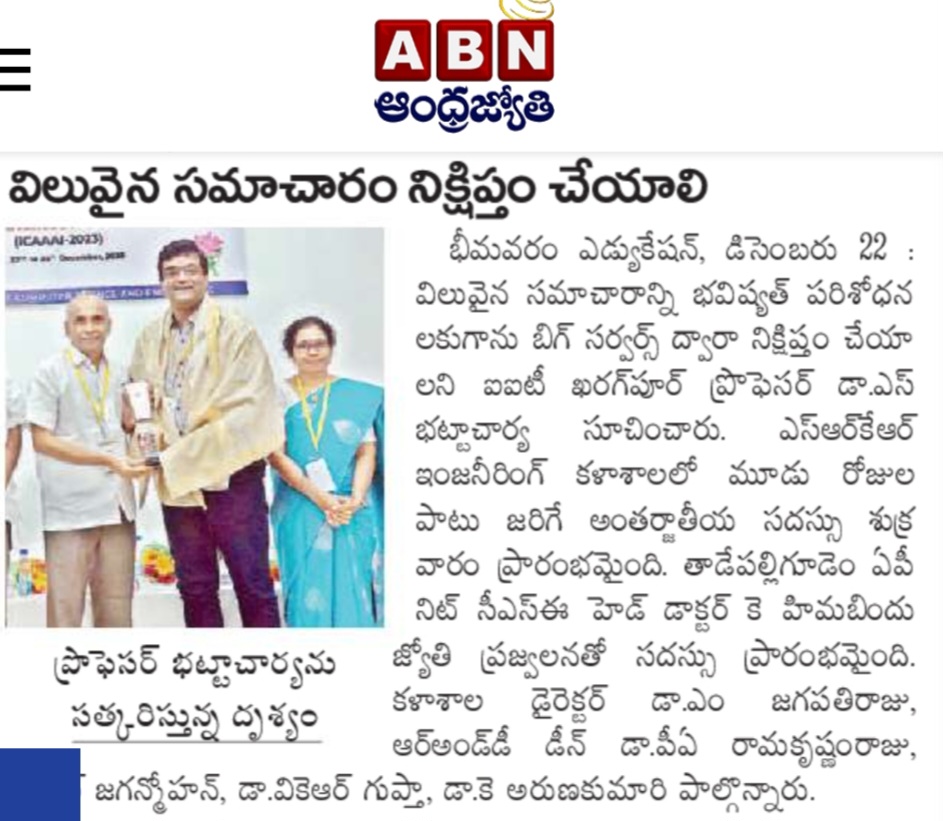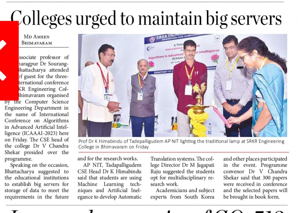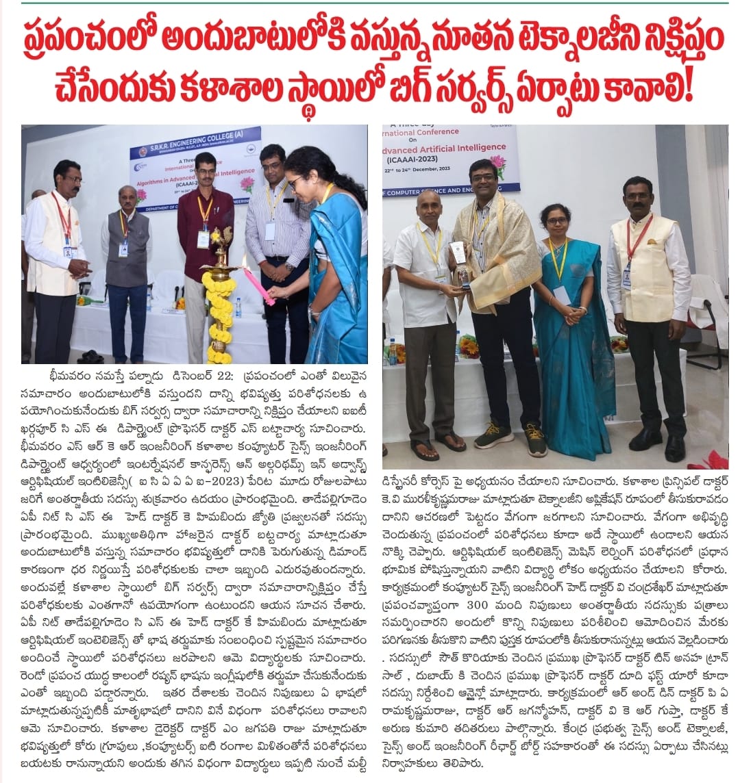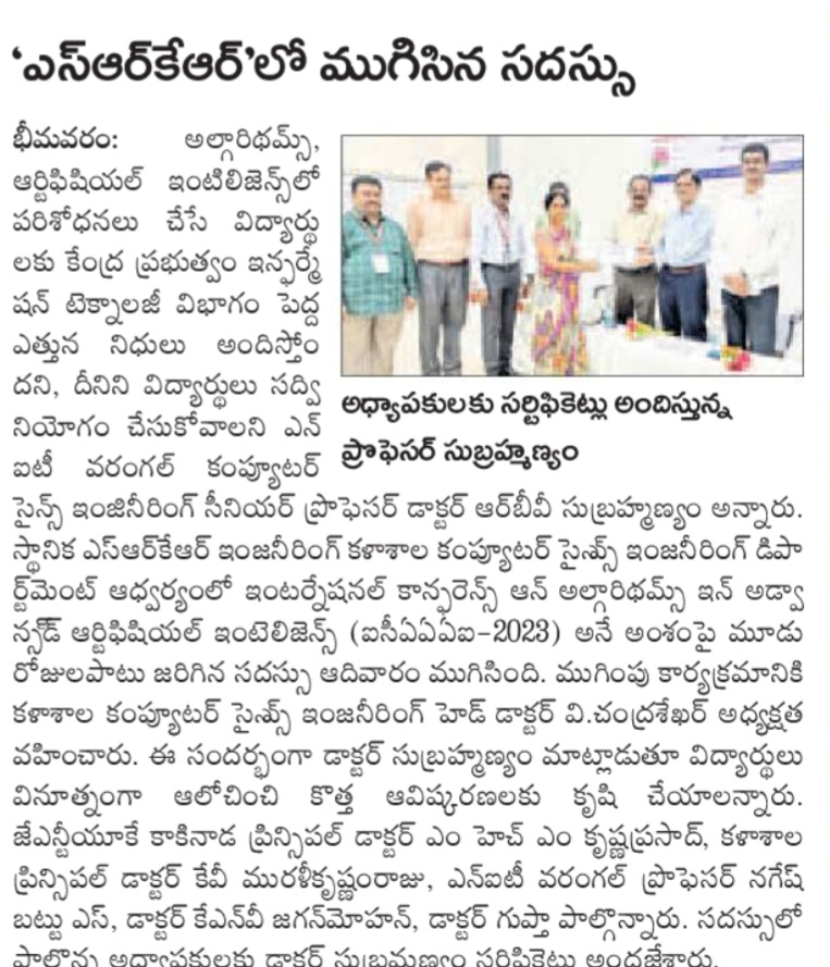 SRKR Engineering College recently concluded the International Conference on Advanced Artificial Intelligence (ICAAI-2023) in a three-day event. Dr. RBV Subrahmanyam garu, a senior professor from NKT Warangal, highlighted the government's substantial funding for students researching algorithms and AI.
