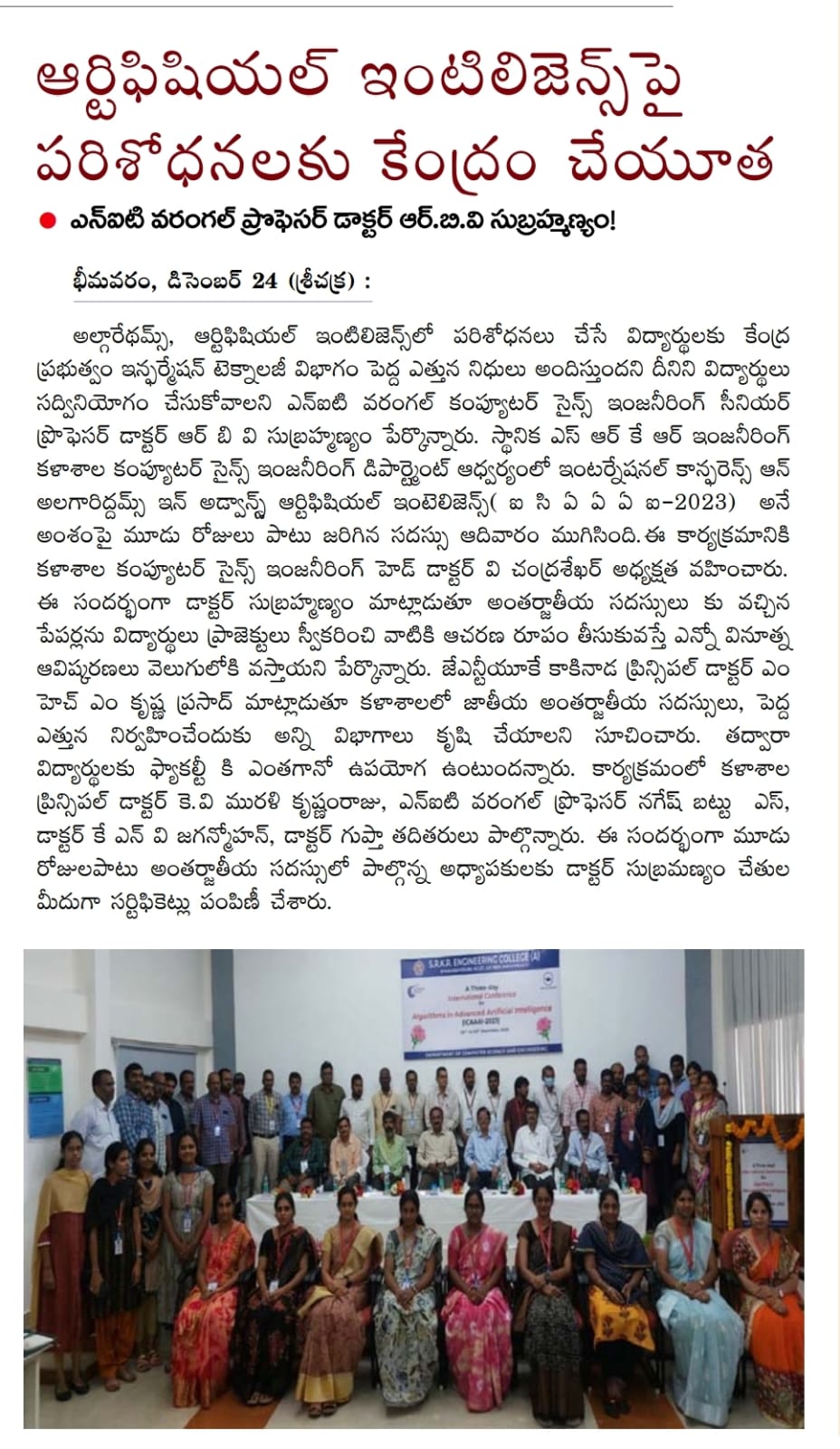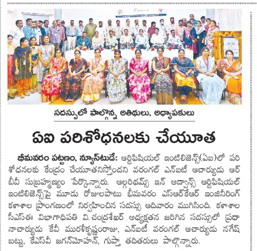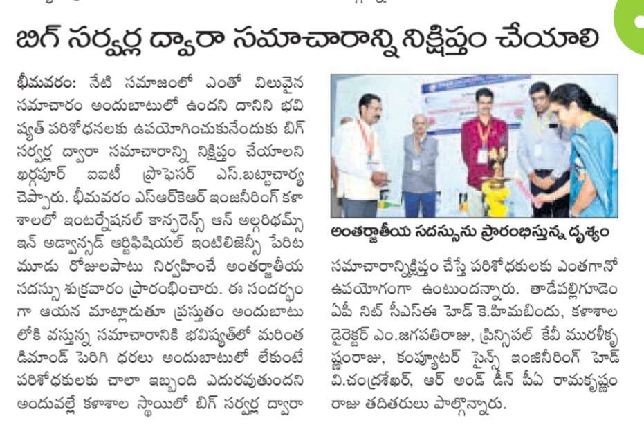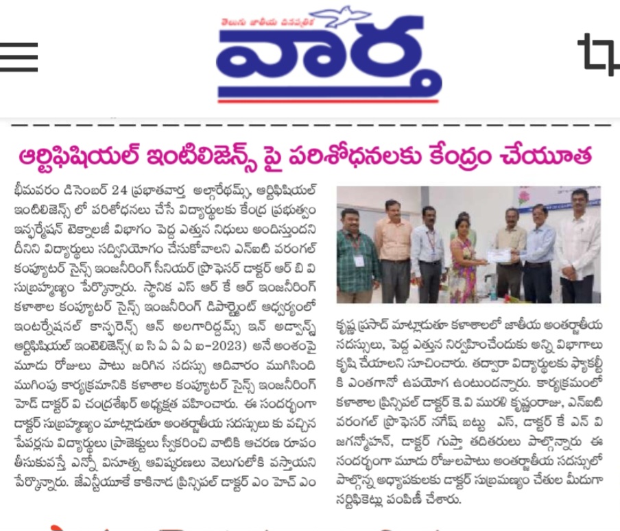 SRKR Engineering College recently concluded the International Conference on Advanced Artificial Intelligence (ICAAI-2023) in a three-day event. Dr. RBV Subrahmanyam garu, a senior professor from NKT Warangal, highlighted the government's substantial funding for students researching algorithms and AI.