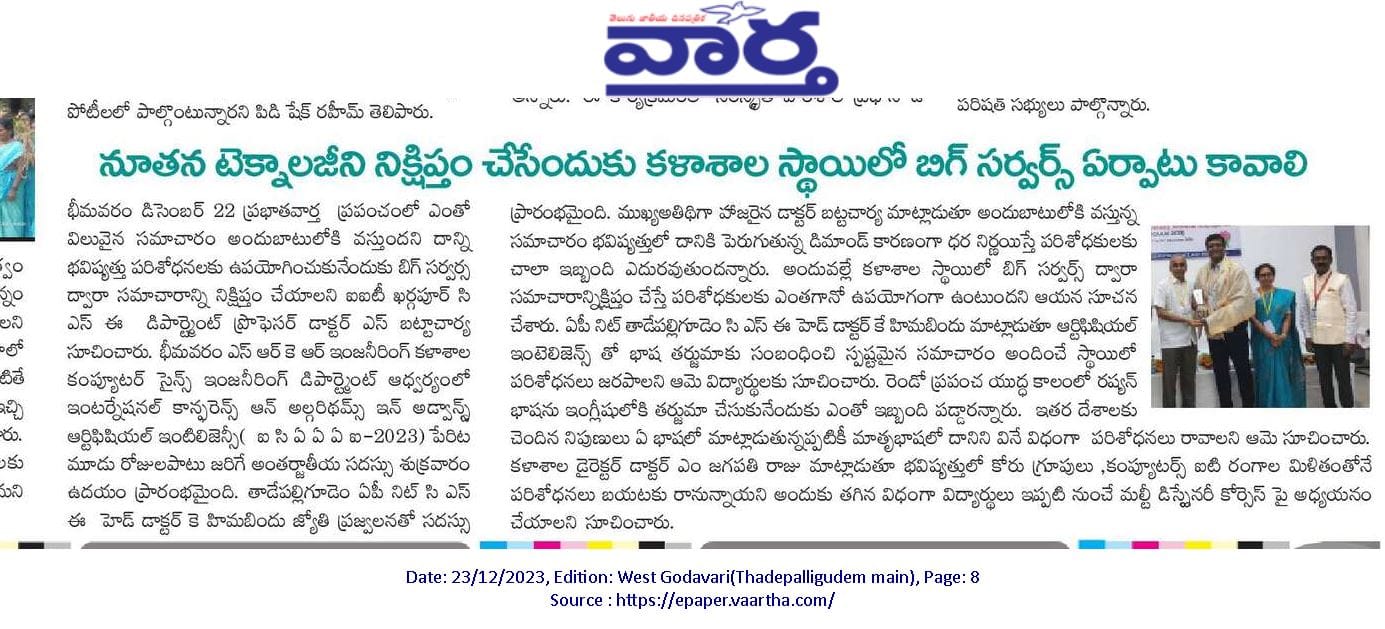 The conference provided a valuable platform for exploring the latest developments in AI and algorithms. College Principal Dr. KV Murali Krishnamraju garu, NIT Warangal Professor Nagesh Battu S, Dr. KNV Jaganmohan garu, Dr. Gupta garu and others participated in the program. On this occasion, certificates were distributed by Dr. Subramaniam garu to the teachers who participated in the international conference for three days.