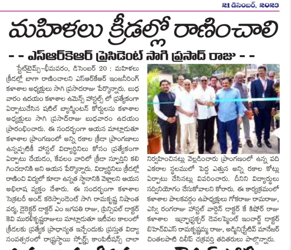 President Prasadaraju garu conveyed his hopes for women students to excel in sports and achieve higher positions in education. College Secretary and Correspondent Sagi Ramakrishna Nishantha Verma garu, along with Director Dr. M Jagapathi Raju garu and Principal Dr. KV Muralikrishnarajulu garu, acknowledged the college's focus on sports, highlighting the numerous state-level competitions held in the recent academic year.