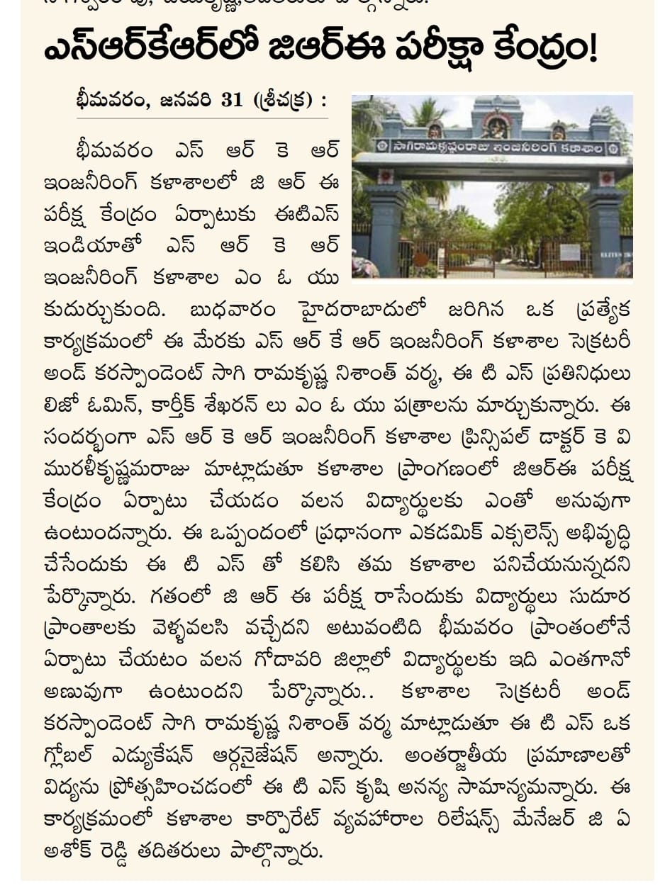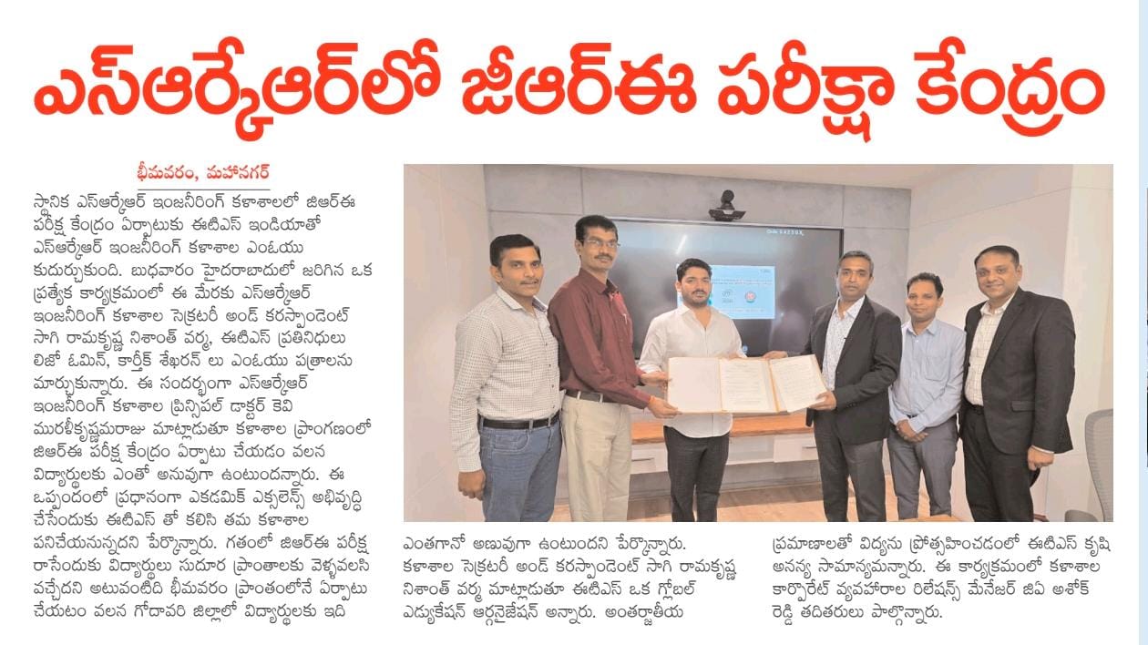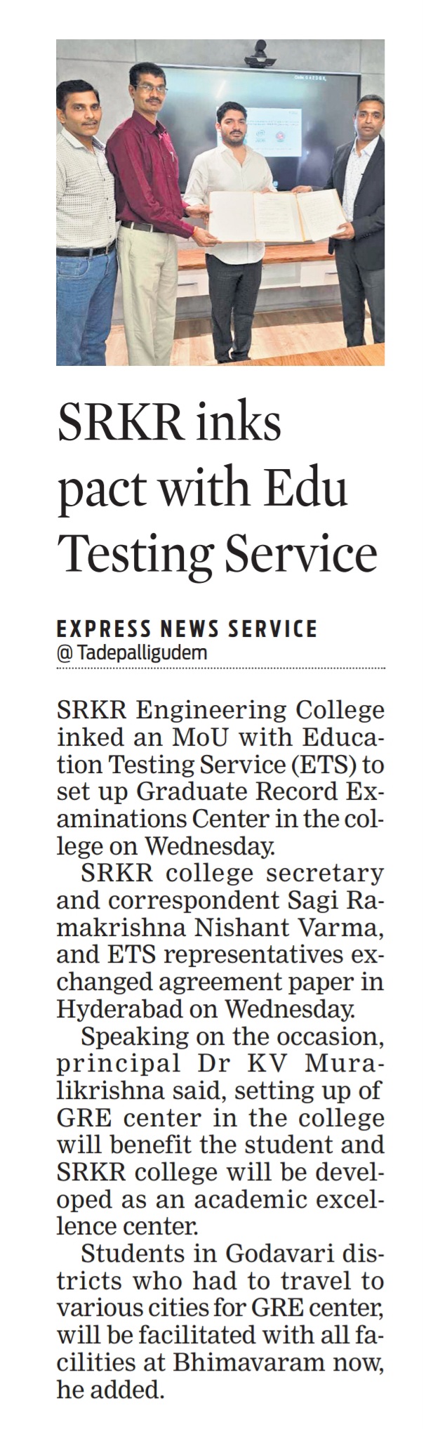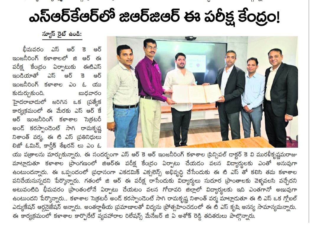 Bhimavaram: SRKR Engineering College has inked a Memorandum of Understanding (MoU) with ETS India to establish a GRE Examination Center on its premises. The MoU exchange took place during a special event held in Hyderabad on Wednesday, with Sagi Ramakrishna Nishant Verma garu, Secretary, and Correspondent of SRKR Engineering College, alongside Lijo Omin and Karthik Sekharan, representatives of ETS, formalizing the agreement.