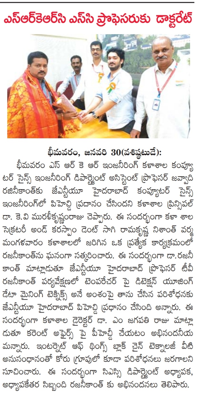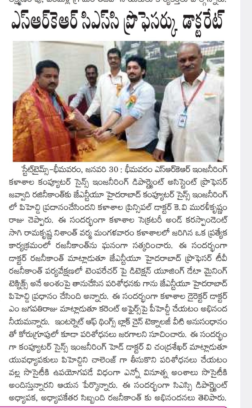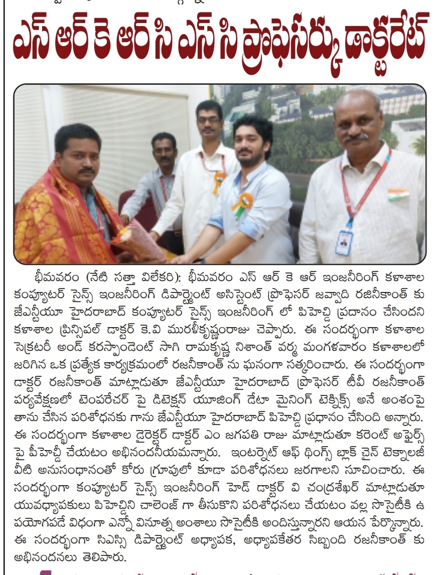 In a special event, the distinguished Dr. Rajinikanth was honored for his groundbreaking research by JNTU Hyderabad. Dr. Rajinikanth shared insights into his work, specifically focusing on "Temperature Detection Using Data Mining Techniques in Monitoring." JNTU Hyderabad acknowledged the significance of his research by granting him a PhD.