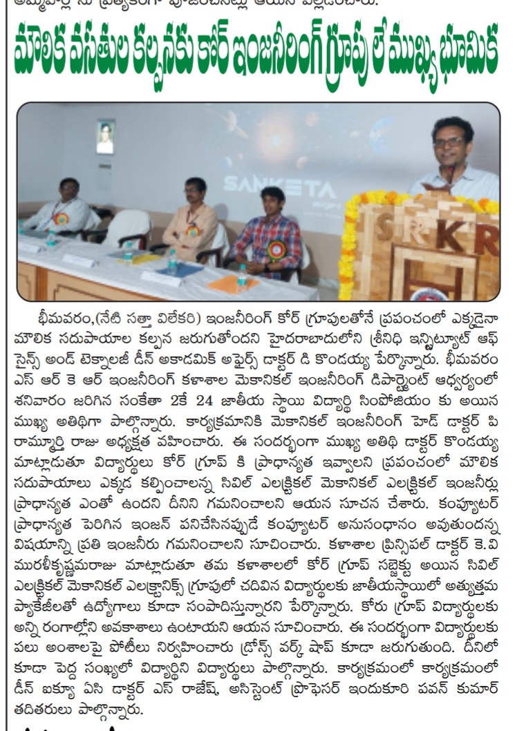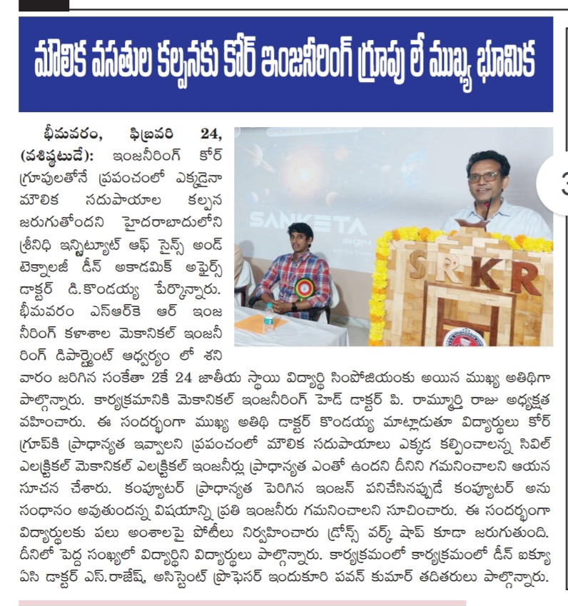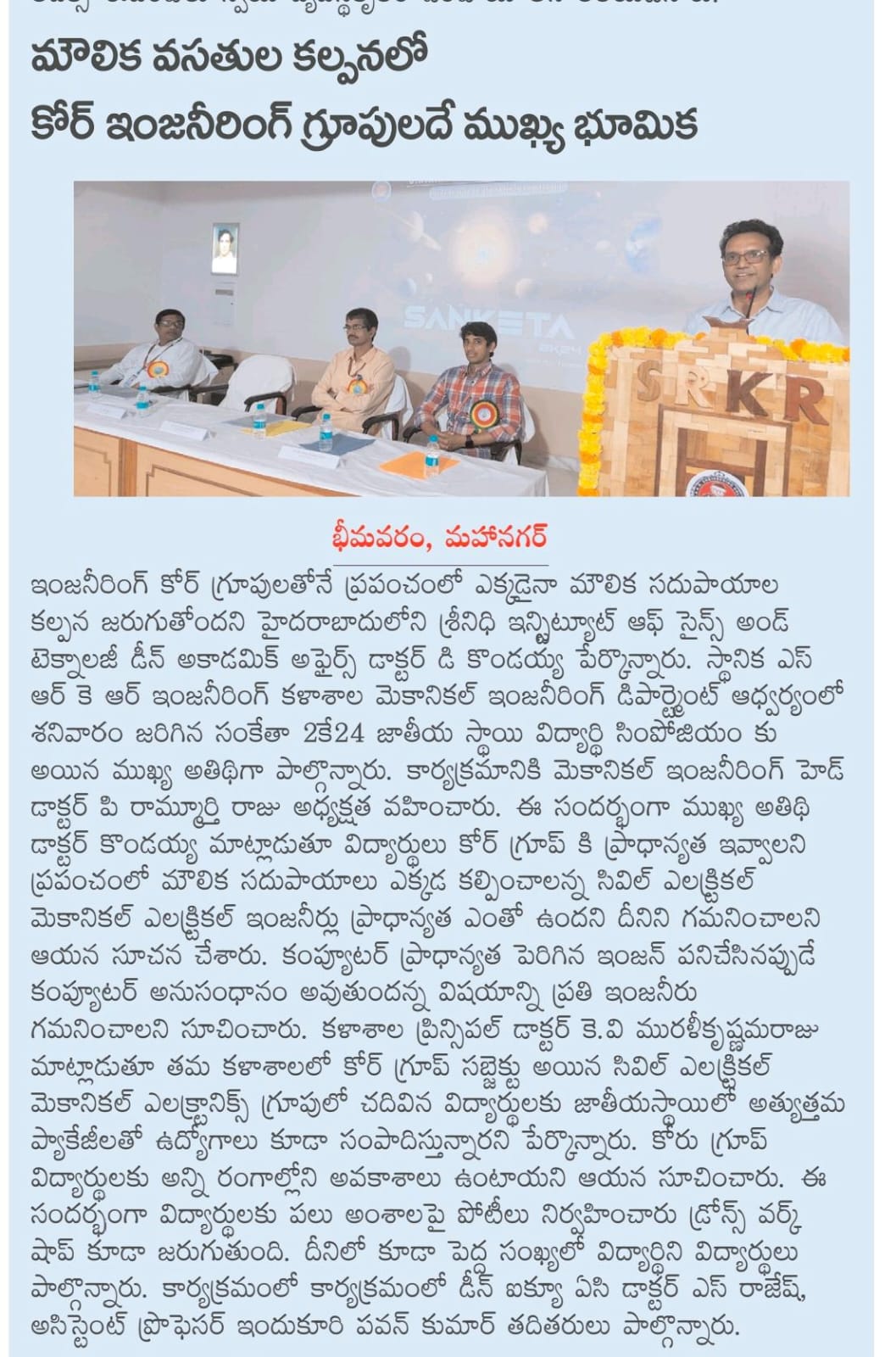 Dr. D. Kondaiyya, the Dean of Academic Affairs at the Srinidhi Institute of Science and Technology in Hyderabad, emphasizes the collaborative efforts among engineering disciplines to innovate fundamental solutions to global challenges. The recent SANKETA 2K24 National Student Symposium, held at the Bhimavaram SRKR Engineering College Mechanical Engineering Department, witnessed engaging discussions led by Dr. P. Rammurthy Raju, the Head of Mechanical Engineering. Dr. Kondaiyya highlighted the importance of civil, electrical, and mechanical engineering in addressing societal needs and urged engineers to stay updated with advancements in computer technology. The principal, Dr. K.V. Muralikrishnamaraju, mentioned the opportunities available to students in various fields, including civil, electrical, mechanical, and electronics, leading to national-level employment prospects. The symposium also included drone workshops and attracted a significant number of participants, showcasing the college's commitment to providing comprehensive opportunities for student development.