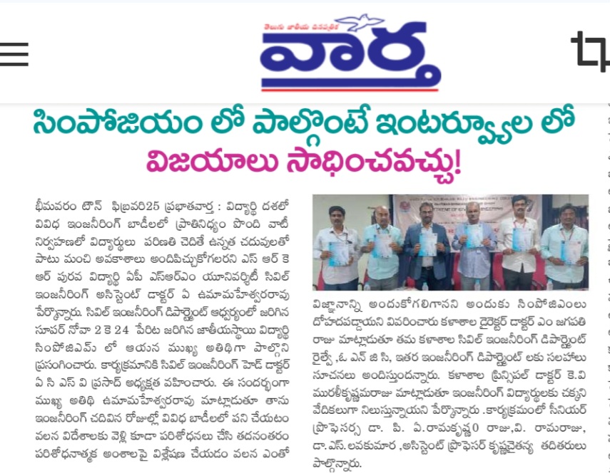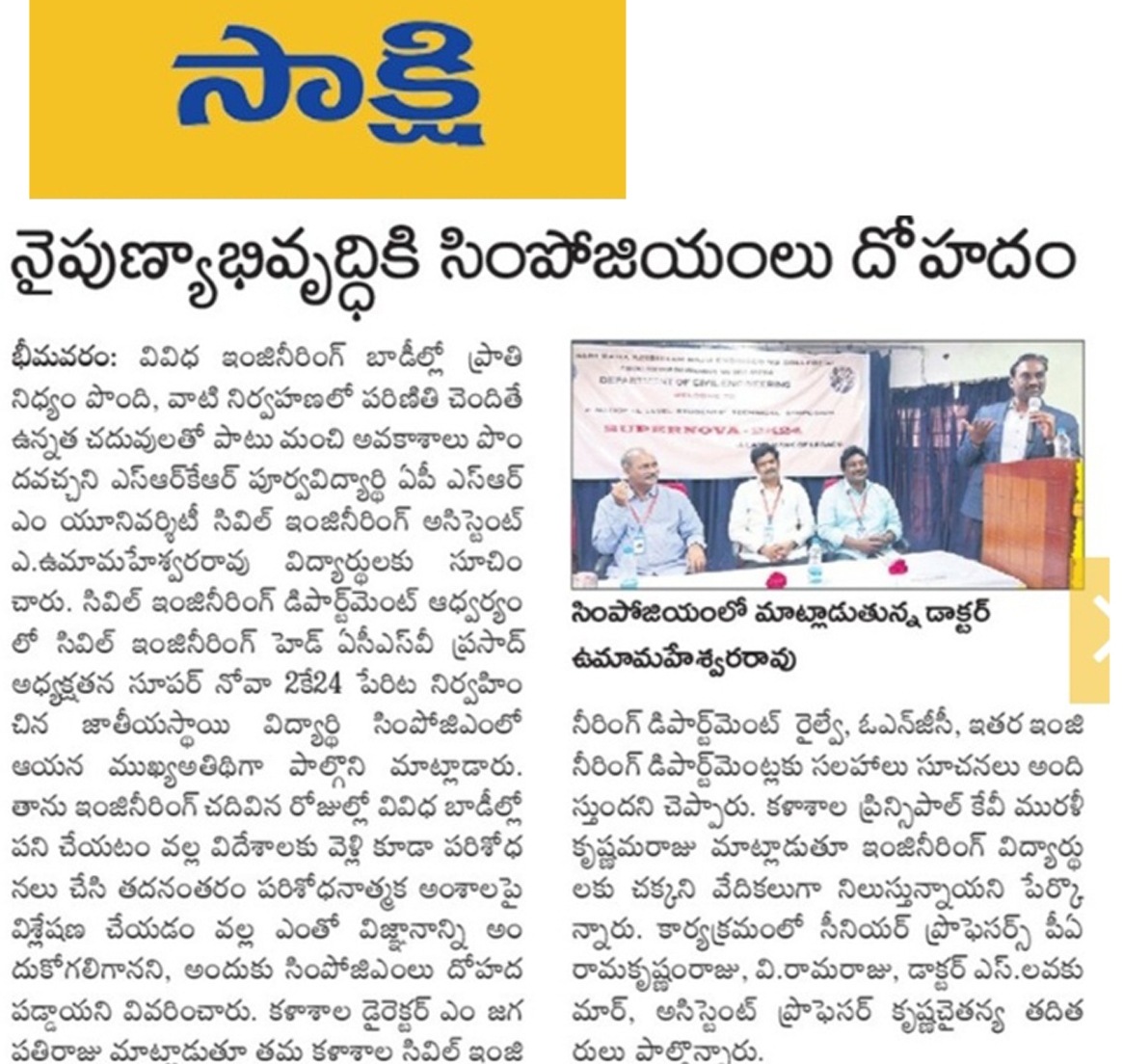 "Former student of SRKR Engineering College, now Assistant Professor of Civil Engineering at AP SRM University, A. Umamaheswararao, addressed students at the SuperNova 2k24 National-Level Symposium, highlighting the significant opportunities available through research and study in various engineering bodies, both domestically and internationally. Reflecting on his own journey from engineering education to overseas exploration and subsequent in-depth research analysis, Umamaheswararao emphasized the immense scientific discoveries that symposiums like SuperNova foster. Director of the college, M. Jagapathiraju, reiterated the importance of such events in nurturing academic growth and fostering innovation within the Civil Engineering Department."
