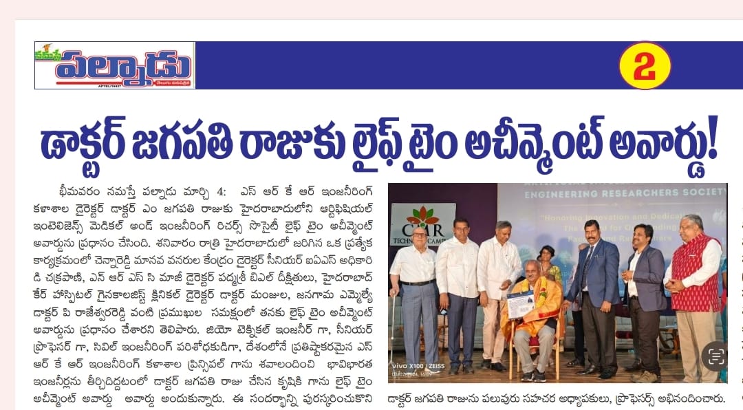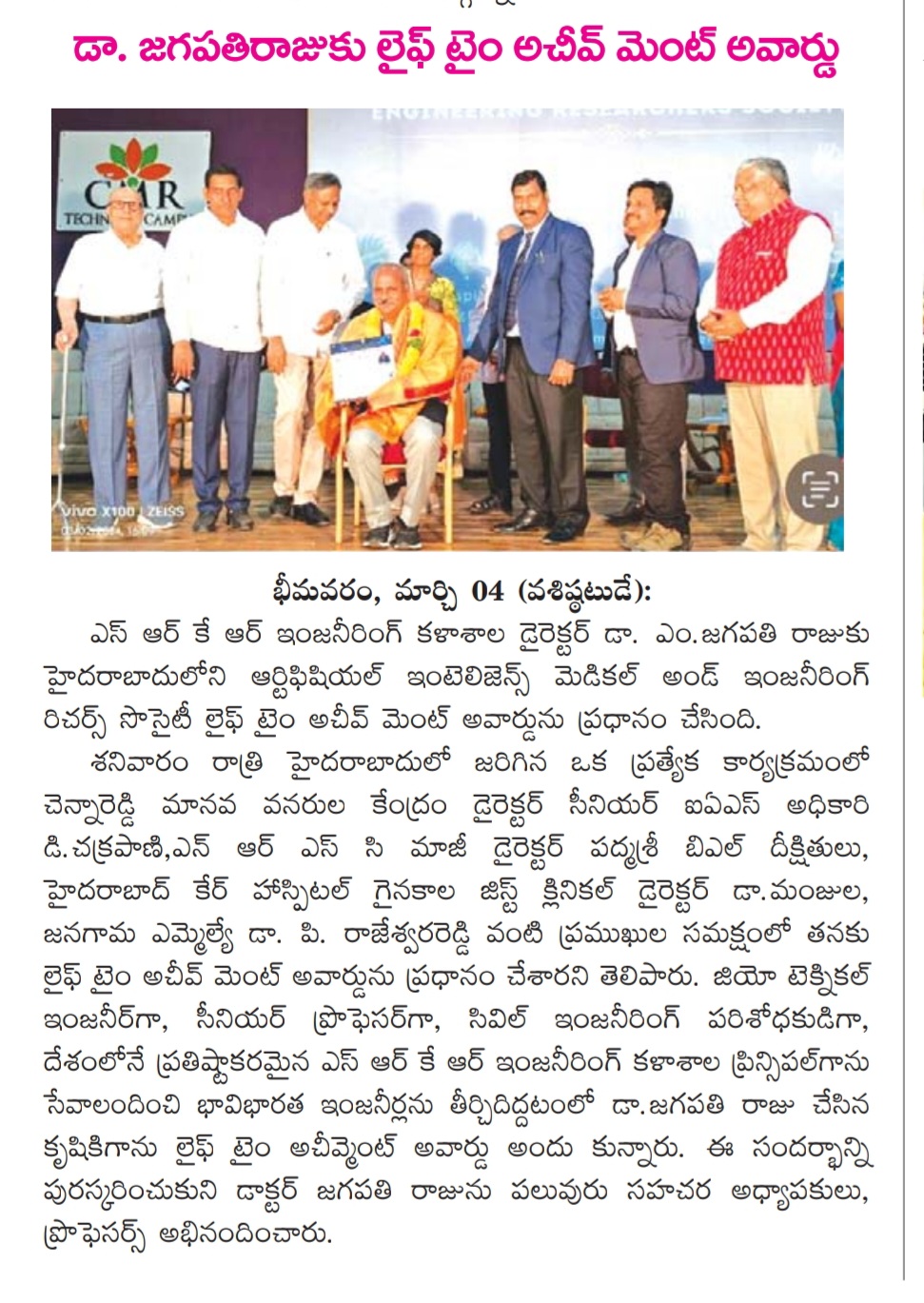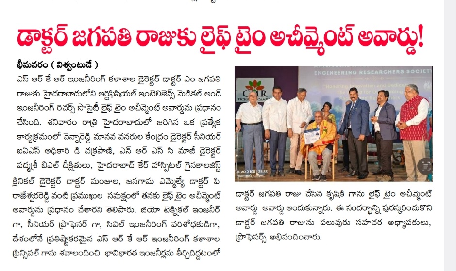 S. R. K. R. Engineering College Director Dr. M. Jagapathi Raju was honored with the Lifetime Achievement Award by the Artificial Intelligence Medical and Engineering Research Society in Hyderabad. The special event, held on Saturday night in Hyderabad, featured former Director of NRSC Padma Sri B L Deekshithulu, Director of Hyderabad Care Hospital gynaecologist Dr.Manjula, and Janagama MLA Dr. P. Rajeshwar Reddy as prominent figures. They highlighted Dr. Jagapathi Raju's significant contributions to the field of civil engineering research, both nationally and internationally, during his tenure as principal at SRKR Engineering College, which has earned widespread acclaim. As a Geo-Technical Engineer, Senior Professor, and Principal of SRKR Engineering College, Dr. Jagapathi Raju's lifetime dedication to serving the engineering fraternity has been duly recognized with this prestigious Lifetime Achievement Award. Esteemed colleagues, professors, and well-wishers extended their heartfelt congratulations to Dr. Jagapathi Raju on this occasion.