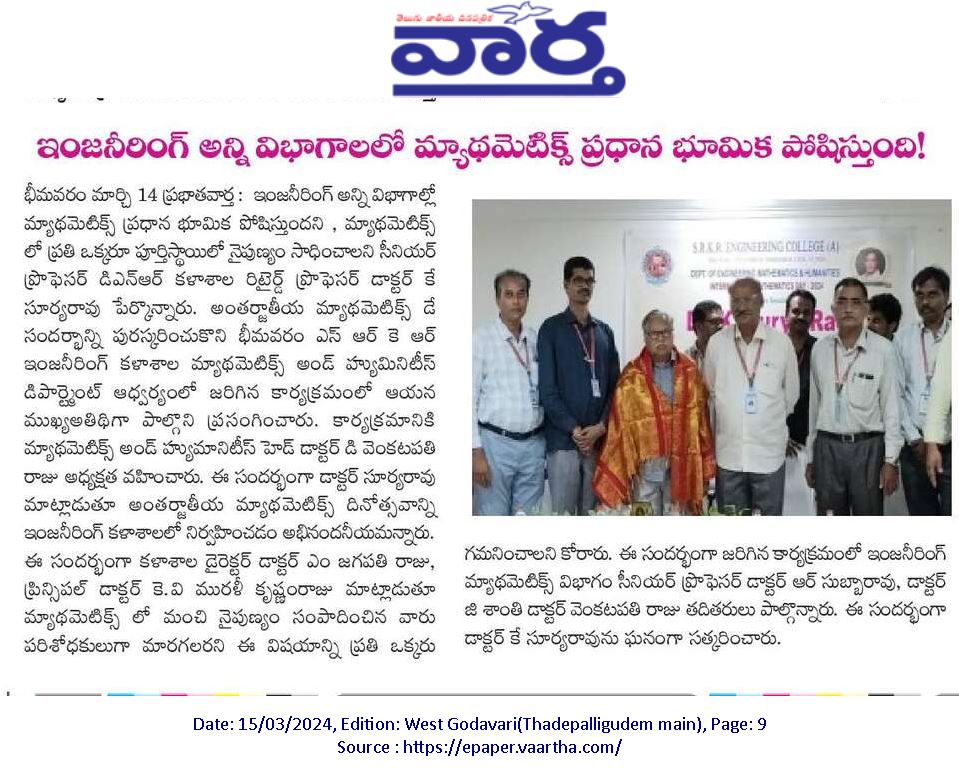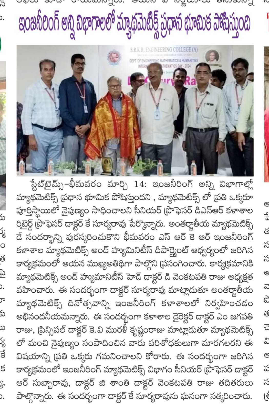 In honor of International Mathematics Day, SRKR Engineering College, Bhimavaram, hosted a special event on March 14 organized by the Department of Mathematics and Humanities. Senior Professor Dr. K Surya Rao garu, retired from DNR College, emphasized the crucial role of mathematics in engineering disciplines, urging proficiency among all. Dr. D. Venkatapathy Raju garu, Head of Mathematics and Humanities, presided over the program