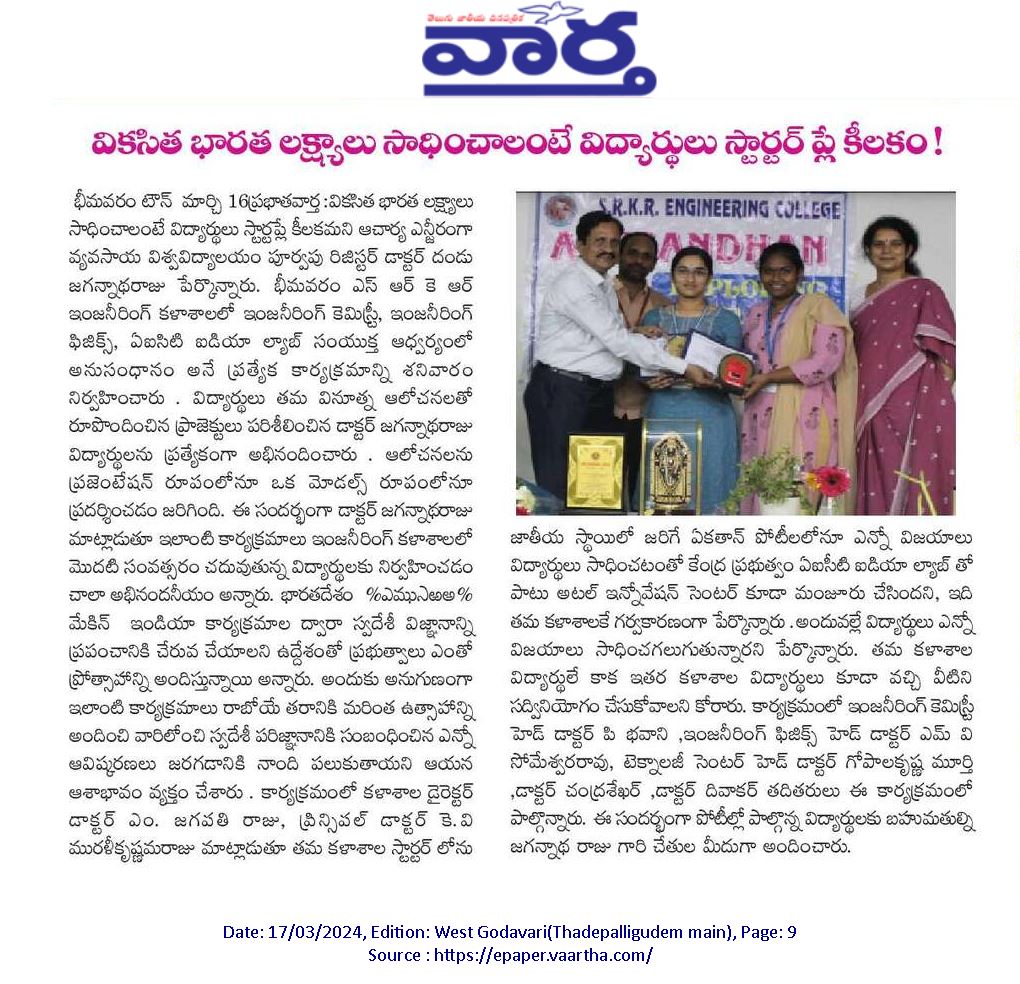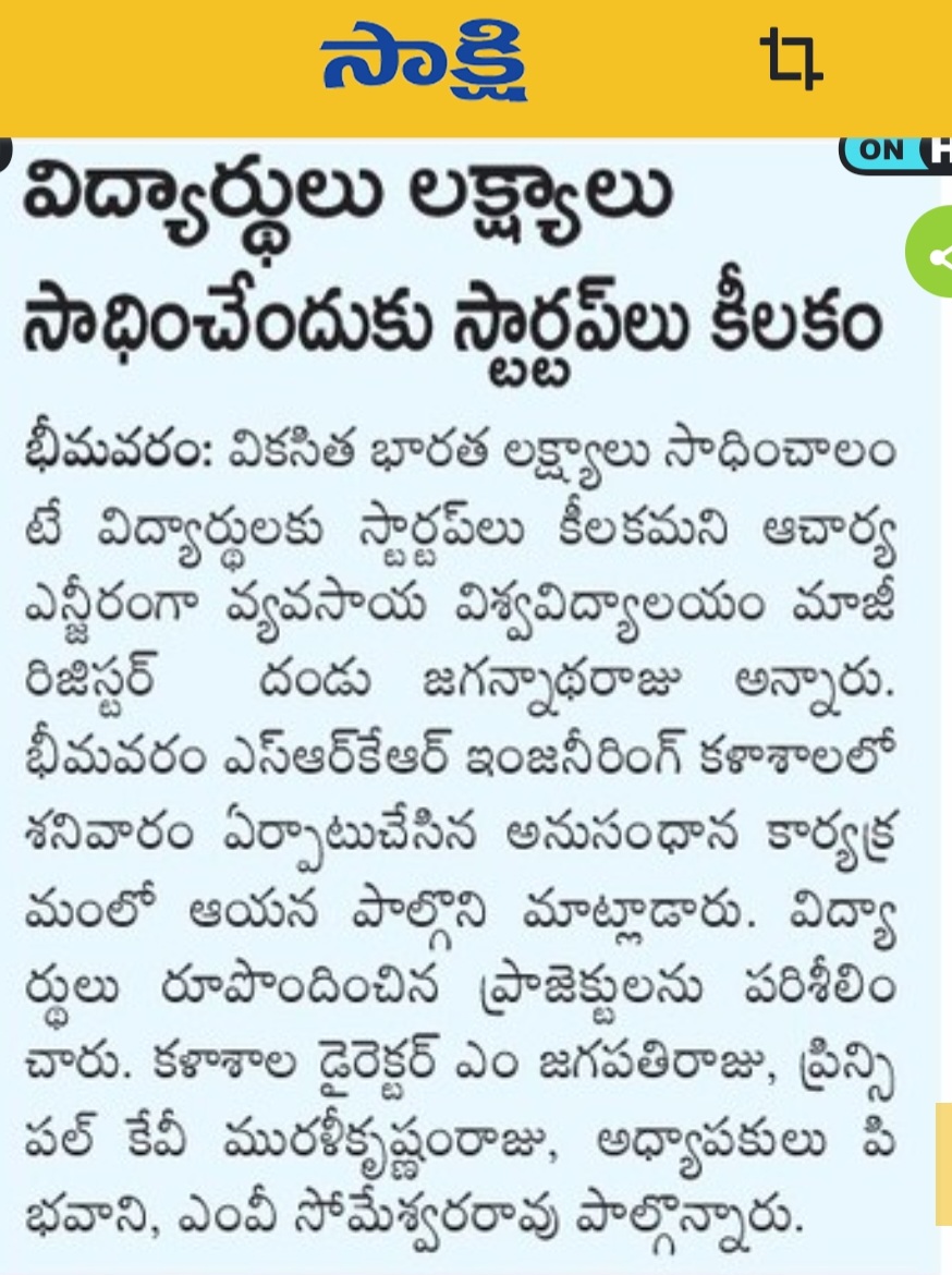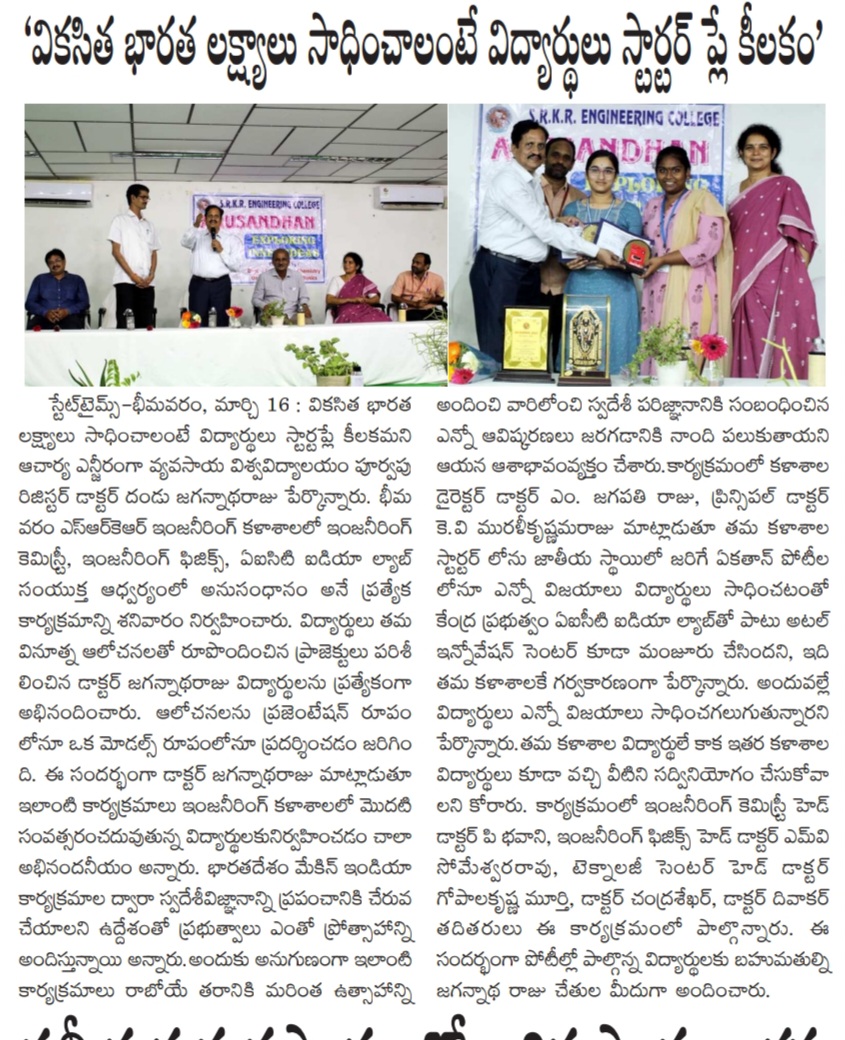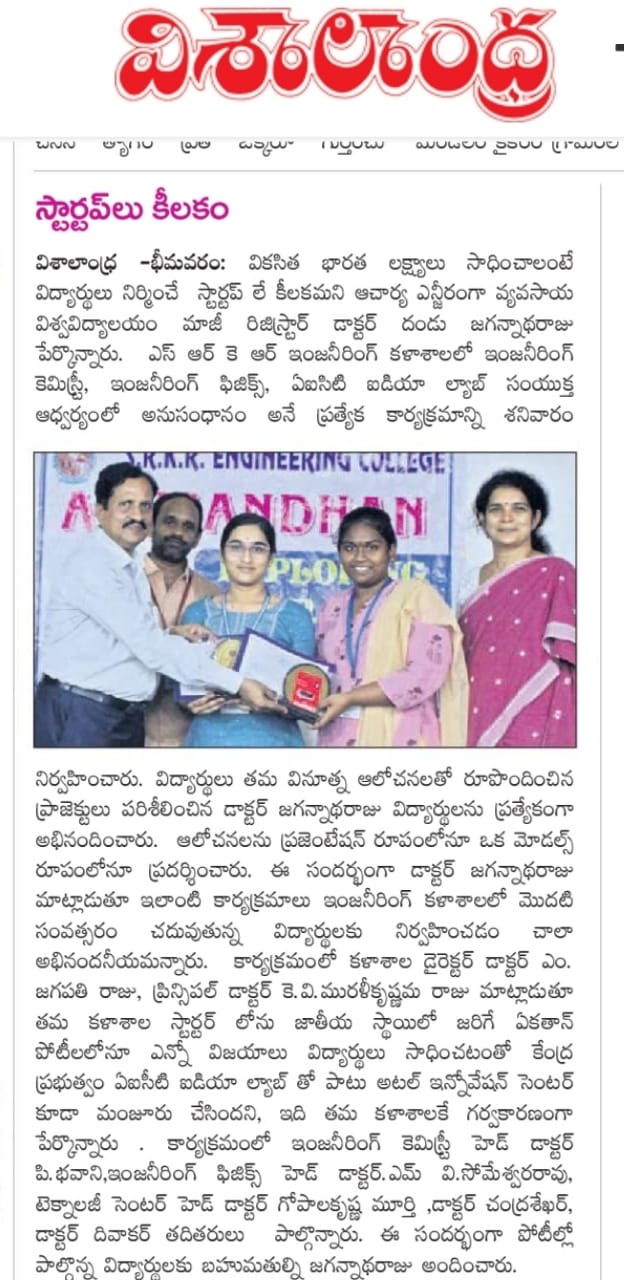 SRKR Engineering College hosted a special program on Saturday, jointly organized by Engineering Chemistry, Engineering Physics, and AICT Idea Lab. Former Registrar of Acharya N.G. Ranga Agricultural University, Dr. Dandu Jagannatharaju garu, emphasized the significance of startups in students' journey towards realizing the vision of a developed India. Dr. Jagannatharaju garu reviewed students' projects, lauding their innovative ideas, and commended the college for fostering such initiatives among first-year engineering students.
