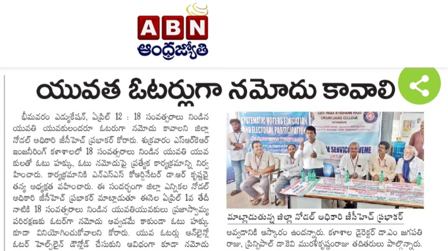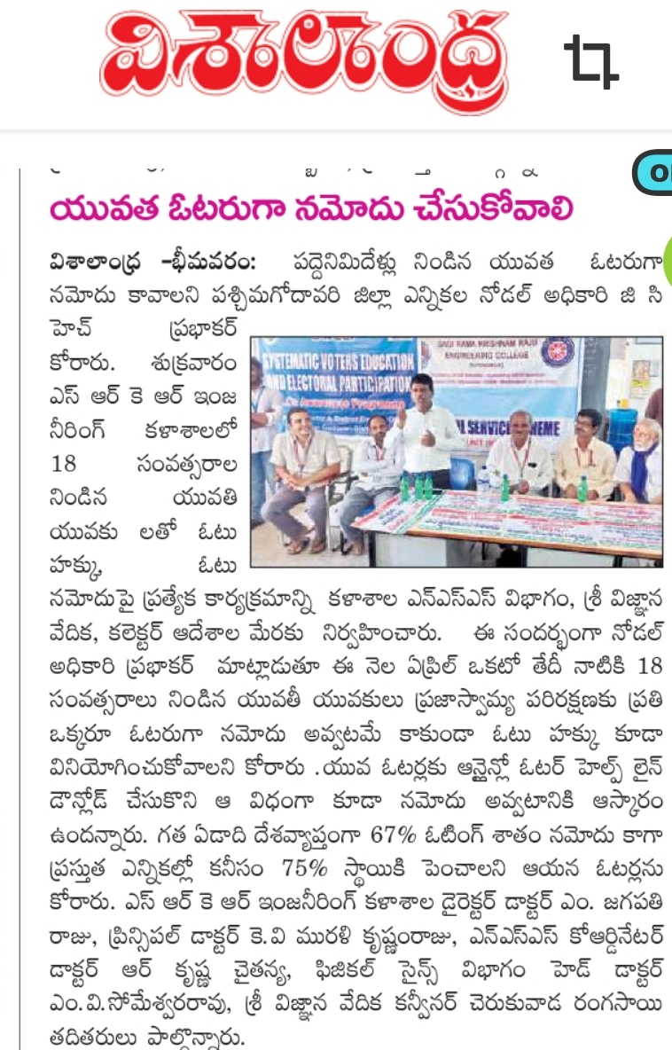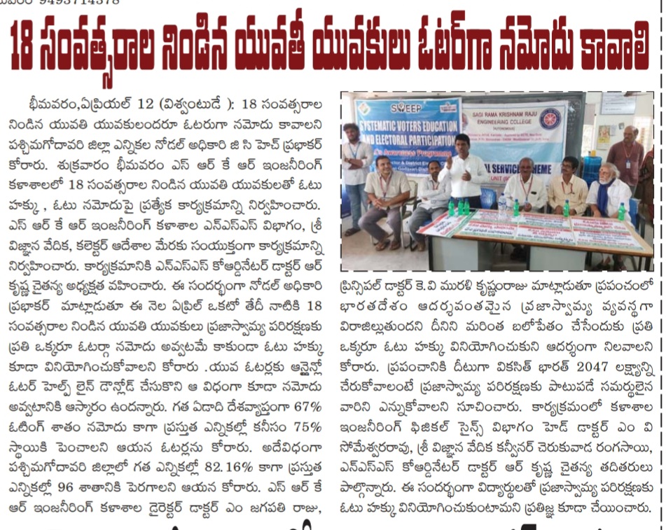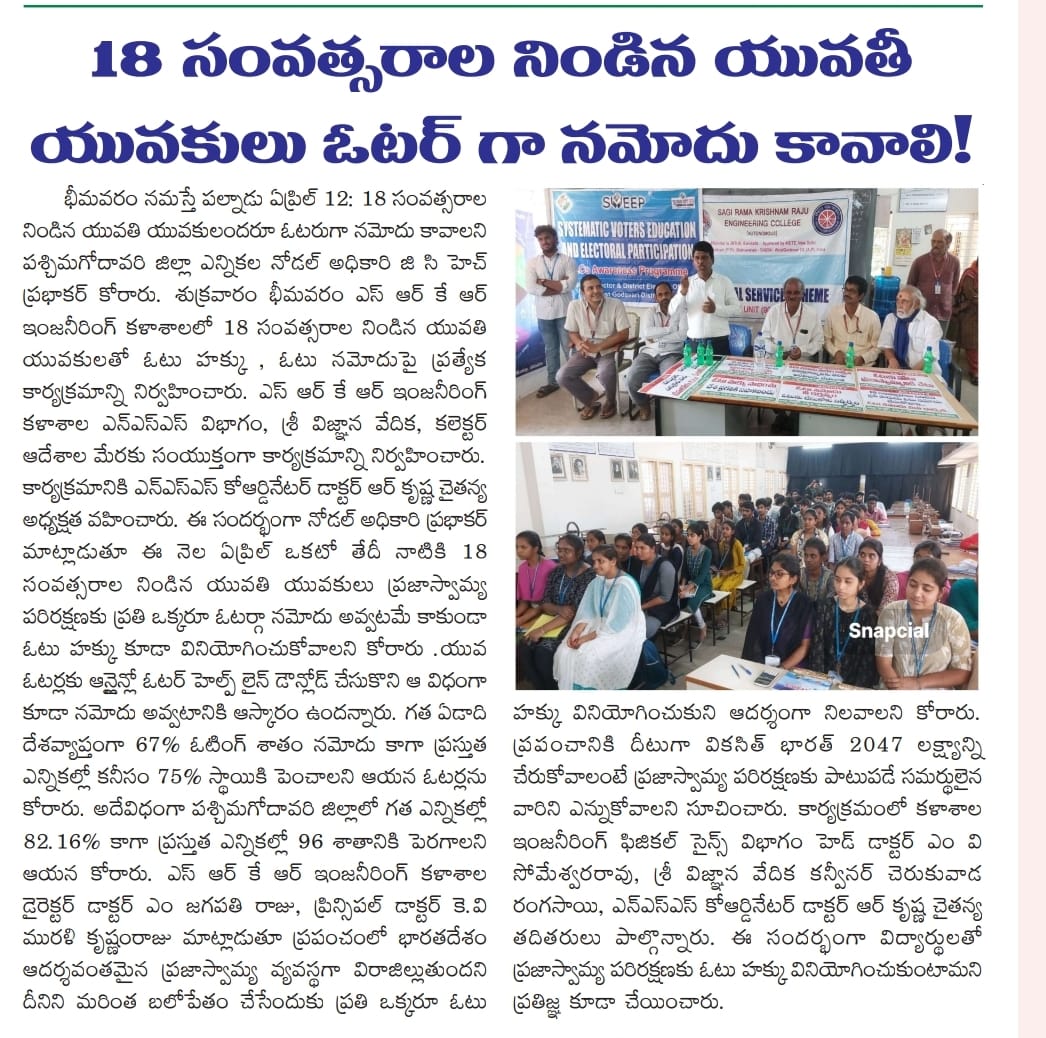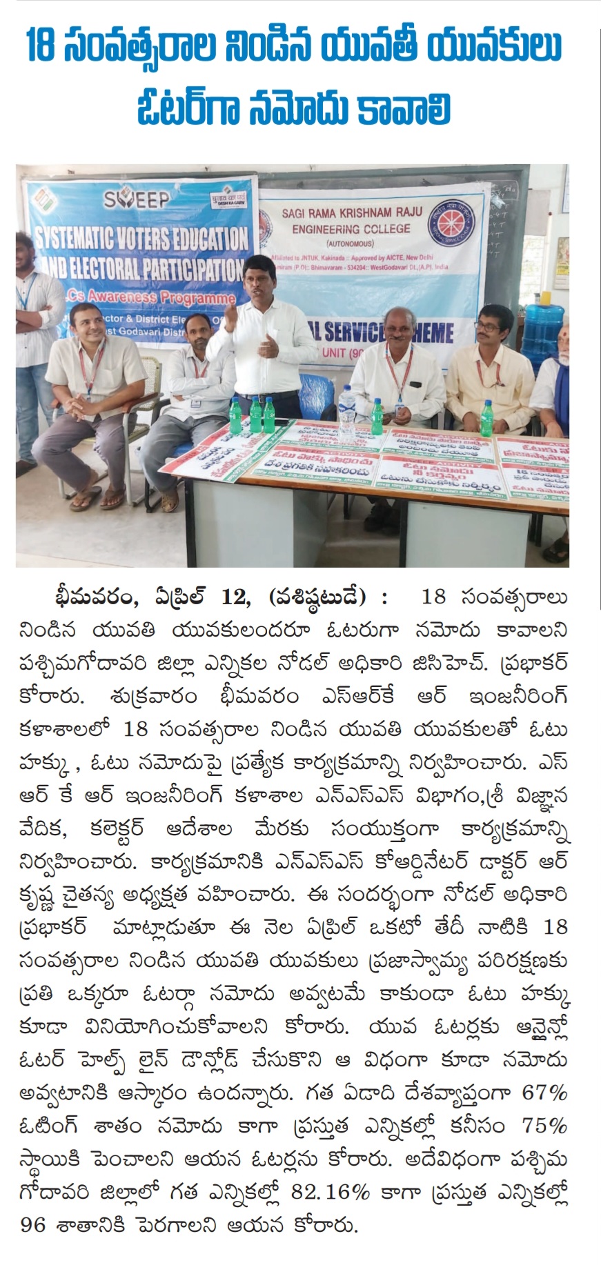Bhimavaram, April 12: District Nodal Officer GCH Prabhakar garu has emphasized the importance of youth registering as voters. Addressing young women and men at SRKER Engineering College, Prabhakar garu highlighted the significance of exercising the right to vote for the protection of democracy. He urged those who turned 18 by April 1st to register and participate actively. NSS Coordinator Dr. R Krishnachai Tanya garu presided over the event, attended by College Director Dr. M Jagapathi Raju garu and Principal Dr. KV Muralikrishnam Raju garu. Prabhakar garu also encouraged downloading the voter helpline for easy registration.